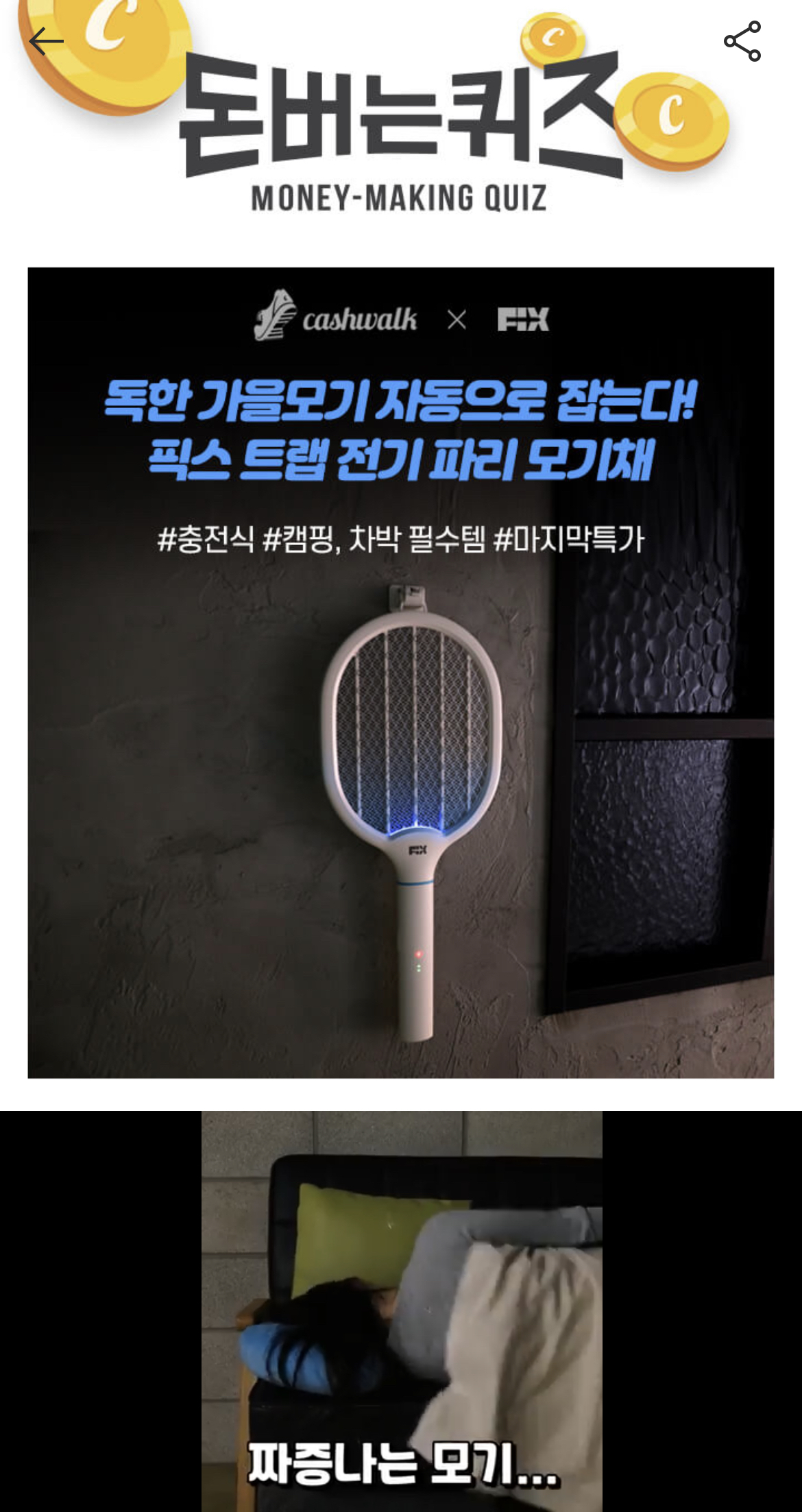 캐시워크 돈버는 퀴즈 정답 픽스 트랩 전기 파리 모기채 전압