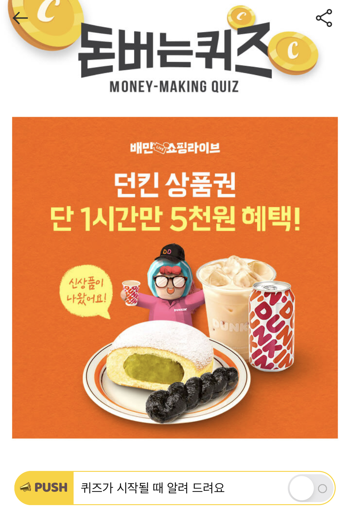캐시워크 돈버는퀴즈 정답 배민쇼핑라이브 던킨 상품권 할인