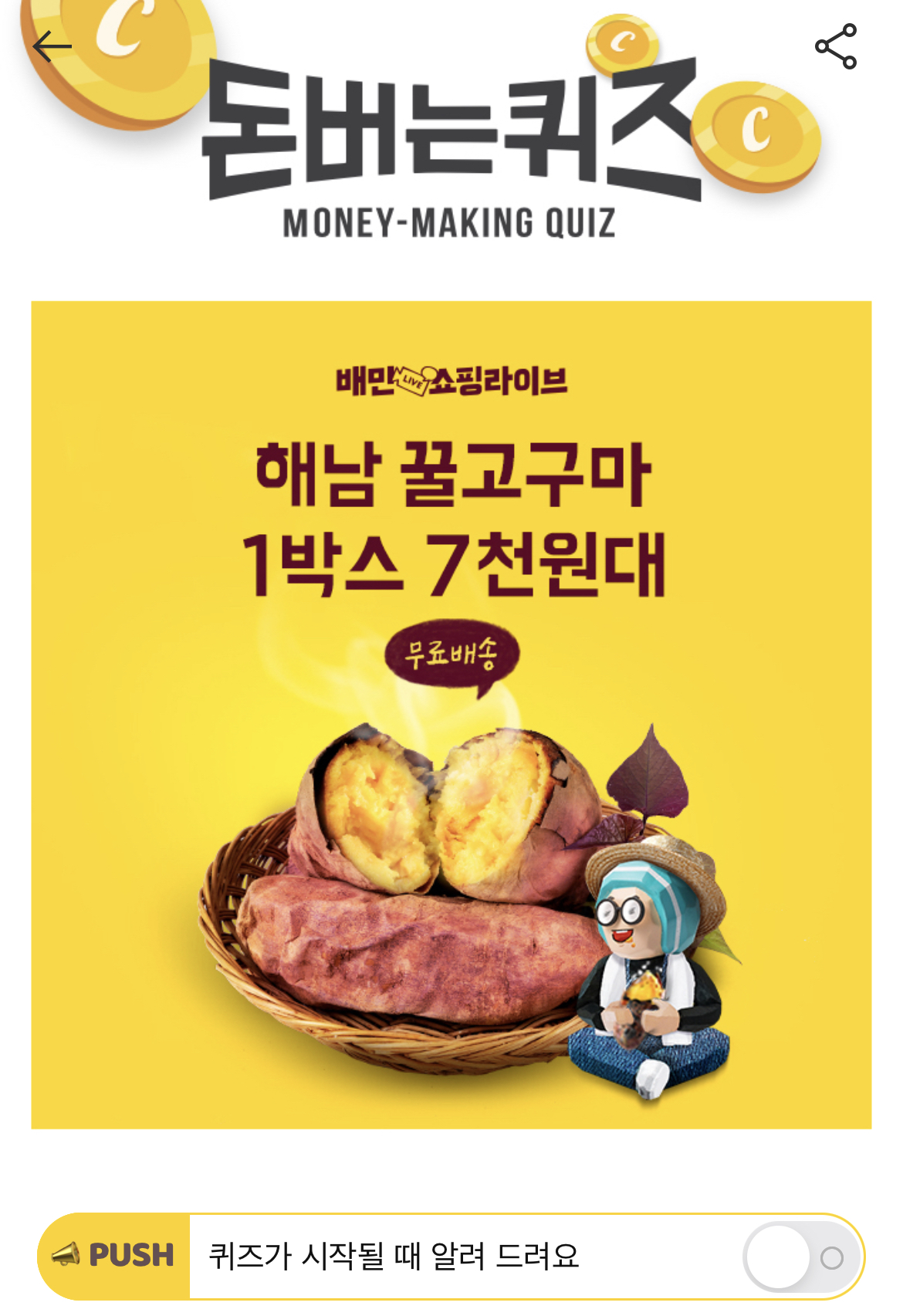 캐시워크 돈버는 퀴즈 정답 배민쇼핑라이브 해남 꿀고구마