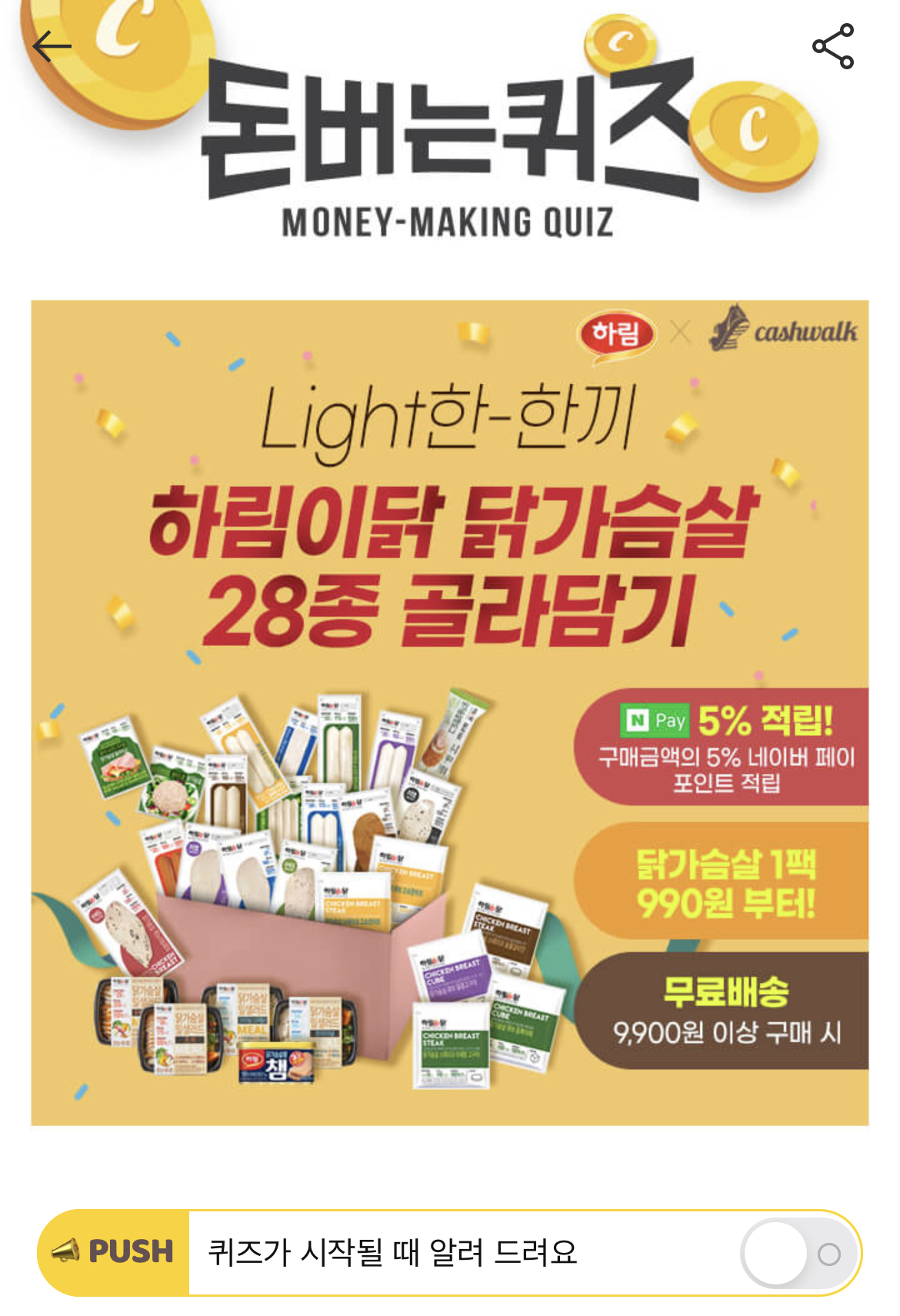 캐시워크 돈버는 퀴즈 정답 하림 하림이닭 닭가슴살 ㅎㄹㄷㄱㅅㅅ