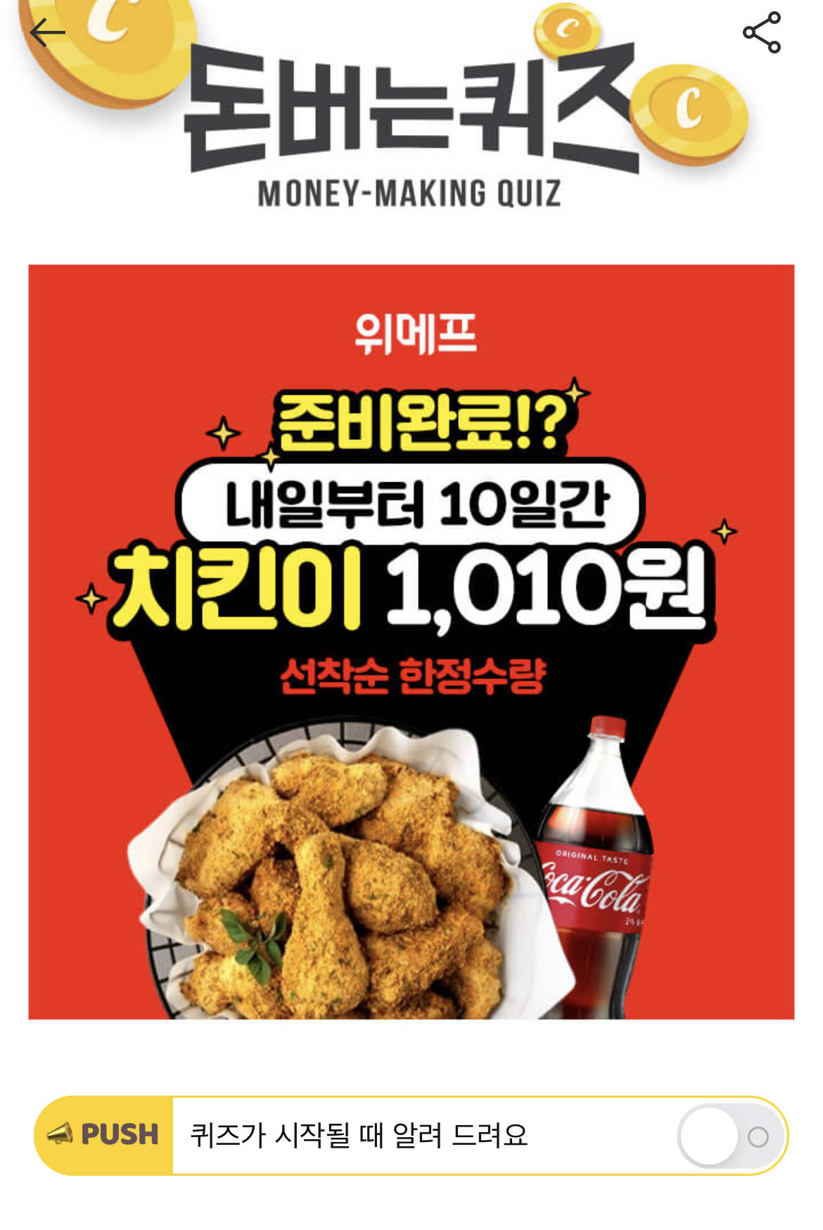 캐시워크 돈버는 퀴즈 정답 위메프 치킨 한정수량