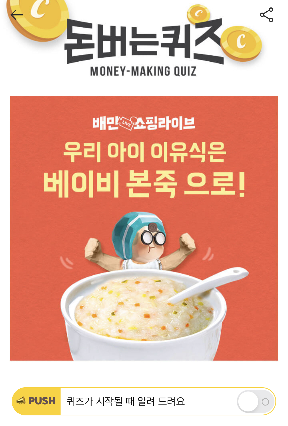 캐시워크 돈버는 퀴즈 정답 배민쇼핑라이브 베이비 본죽 할인