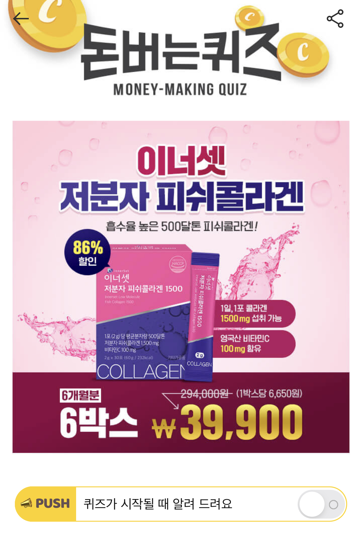 캐시워크 돈버는 퀴즈 정답 이너셋 저분자 피쉬콜라겐 1500 영문