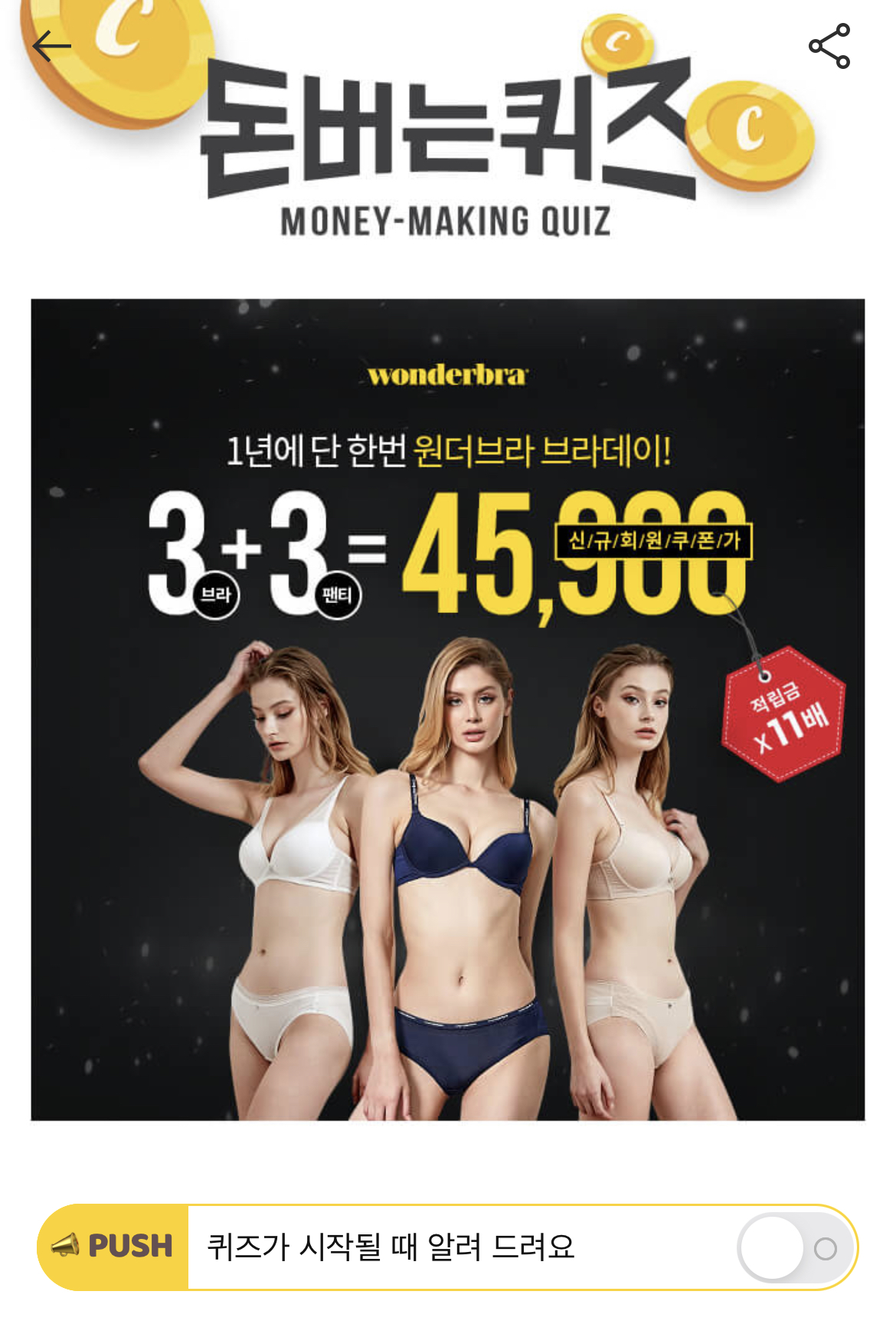 캐시워크 돈버는 퀴즈 정답 프리미엄 이너웨어 브랜드 원더브라 ㅂㄹㄷㅇ