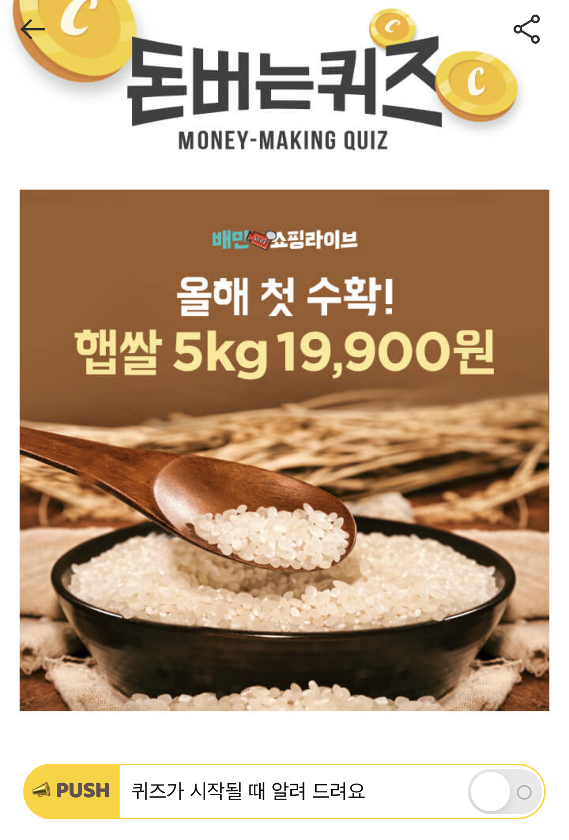 캐시워크 돈버는 퀴즈 정답 배민쇼핑라이브 상주시 햅쌀