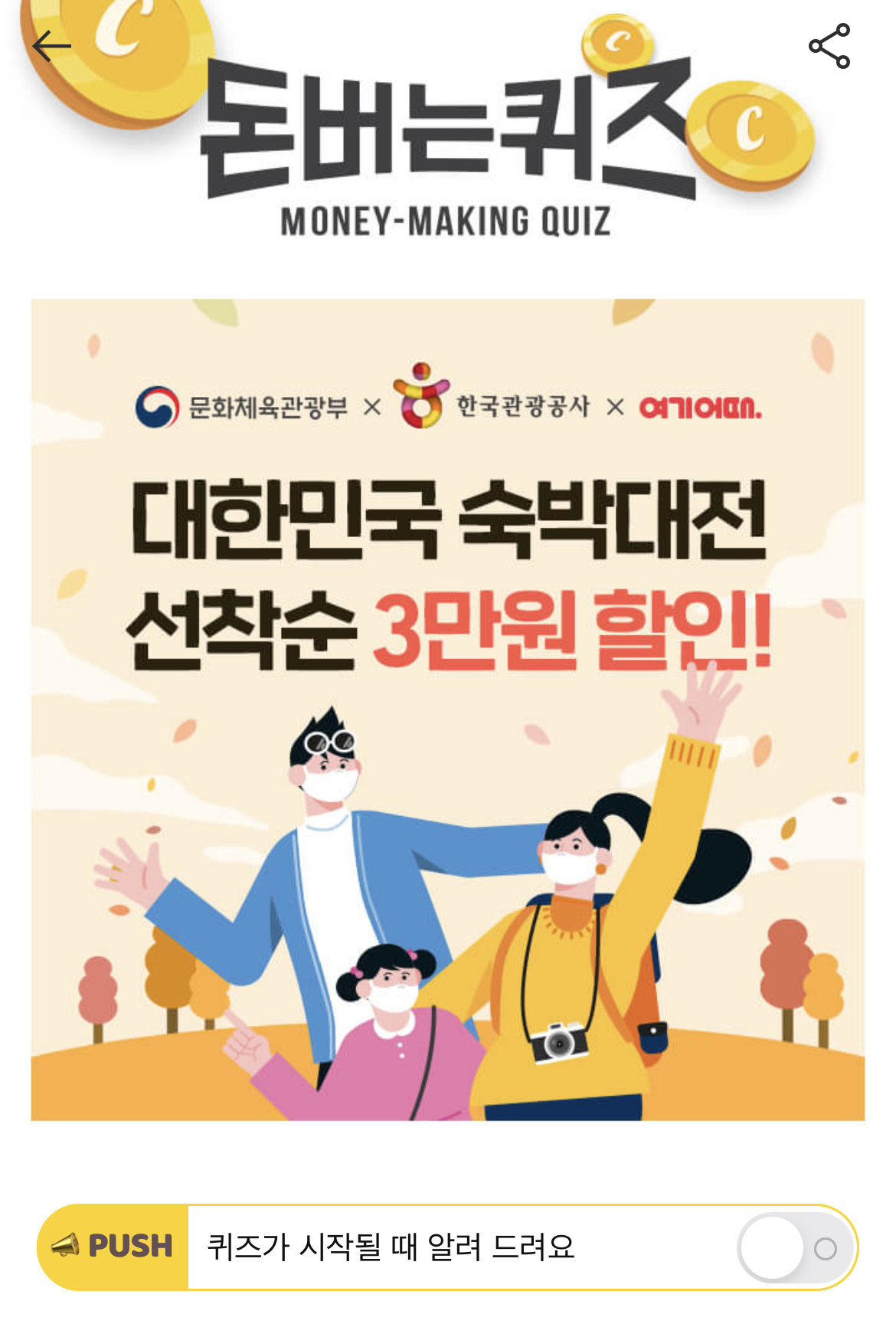 캐시워크 돈버는 퀴즈 정답 여기어때 대한민국 숙박대전 최대 OO% 최대 OO%포인트 적립