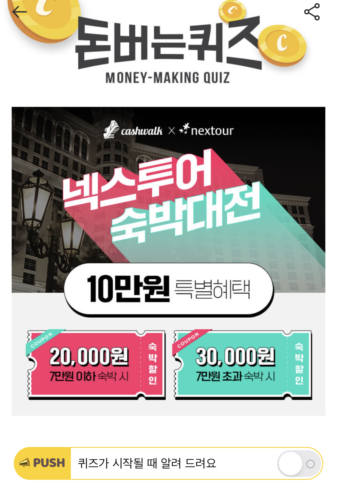 캐시워크 돈버는 퀴즈 정답 넥스투어 숙박대전 이벤트 ㅌㅇㅁㄴ