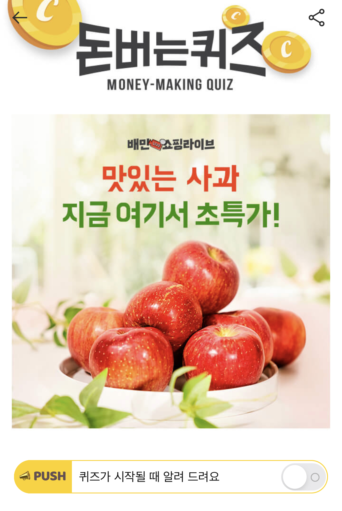 캐시워크 돈버는 퀴즈 정답 배민쇼핑라이브 ㅇㅇ사과