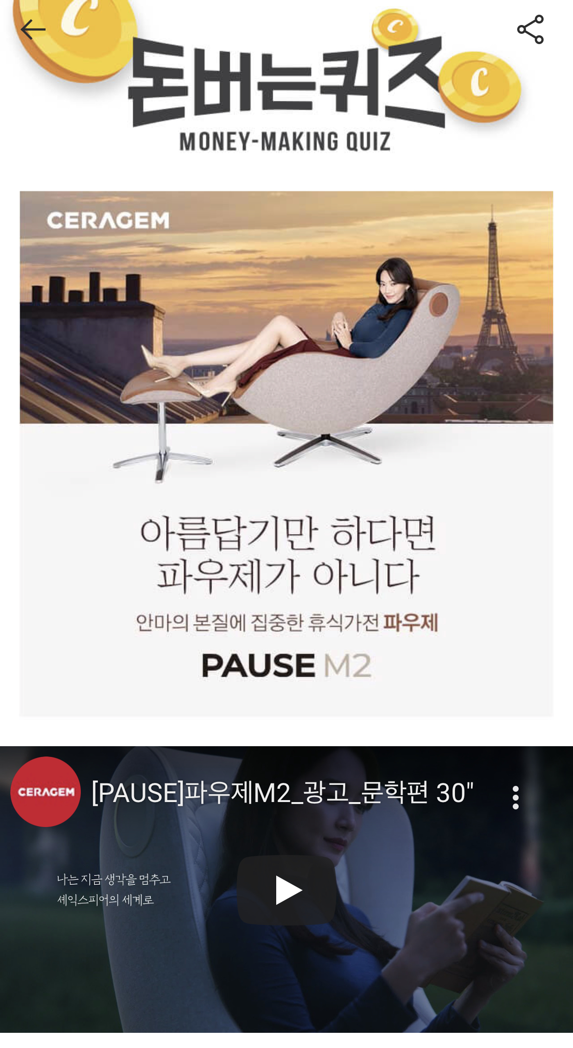 캐시워크 돈버는 퀴즈 정답 세라젬 파우제 M2 ㅇㅁㅇㅈ