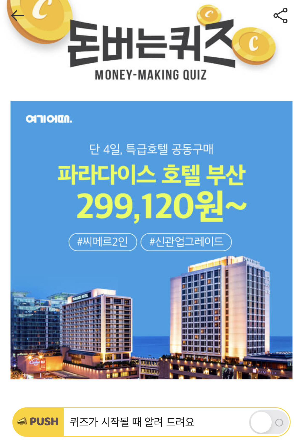 캐시워크 돈버는 퀴즈 정답 여기어때 파라다이스 호텔 부산 공동구매 ㅇㅅㅌㄹㅅ