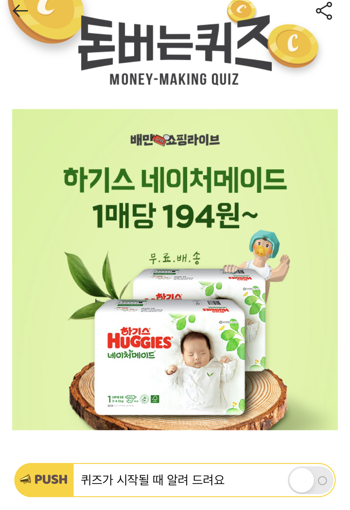 캐시워크 돈버는 퀴즈 정답 배민쇼핑라이브 하기스 네이처메이드 기저귀 숫자