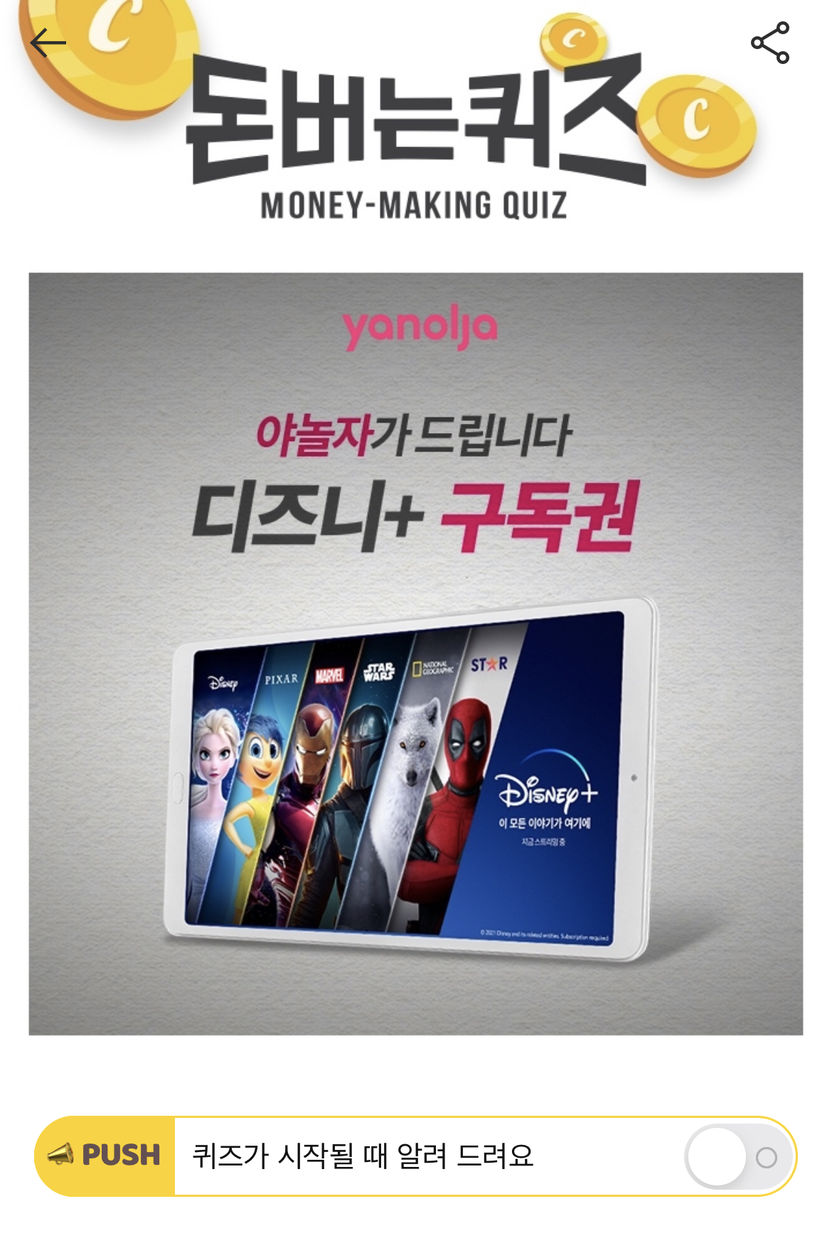 캐시워크 돈버는 퀴즈 정답 야놀자 디즈니+ 구독권 숫자