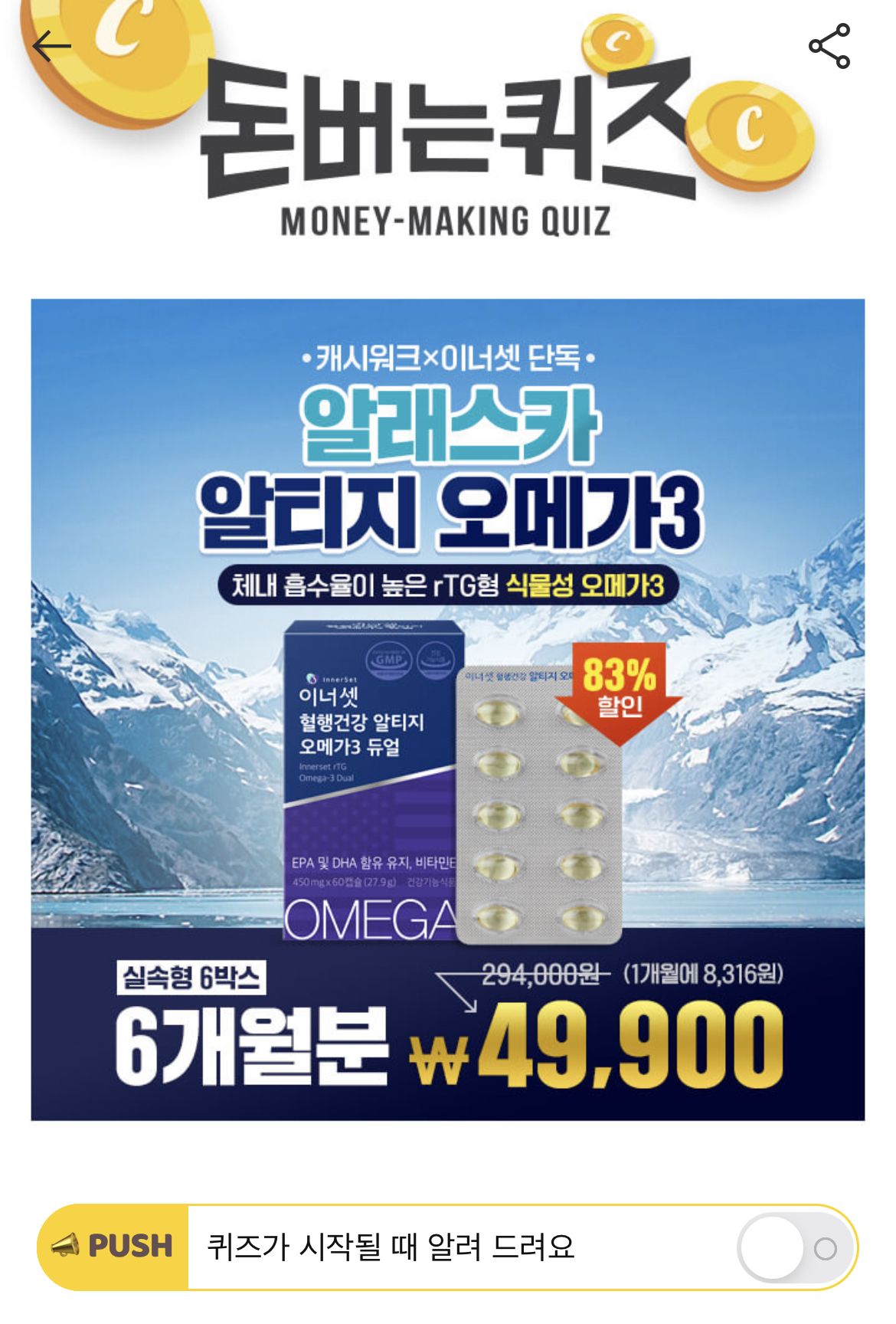 캐시워크 돈버는 퀴즈 정답 이너셋 혈행건강 알티지 오메가3 듀얼 제품 ㅈㅅㅈㅈ