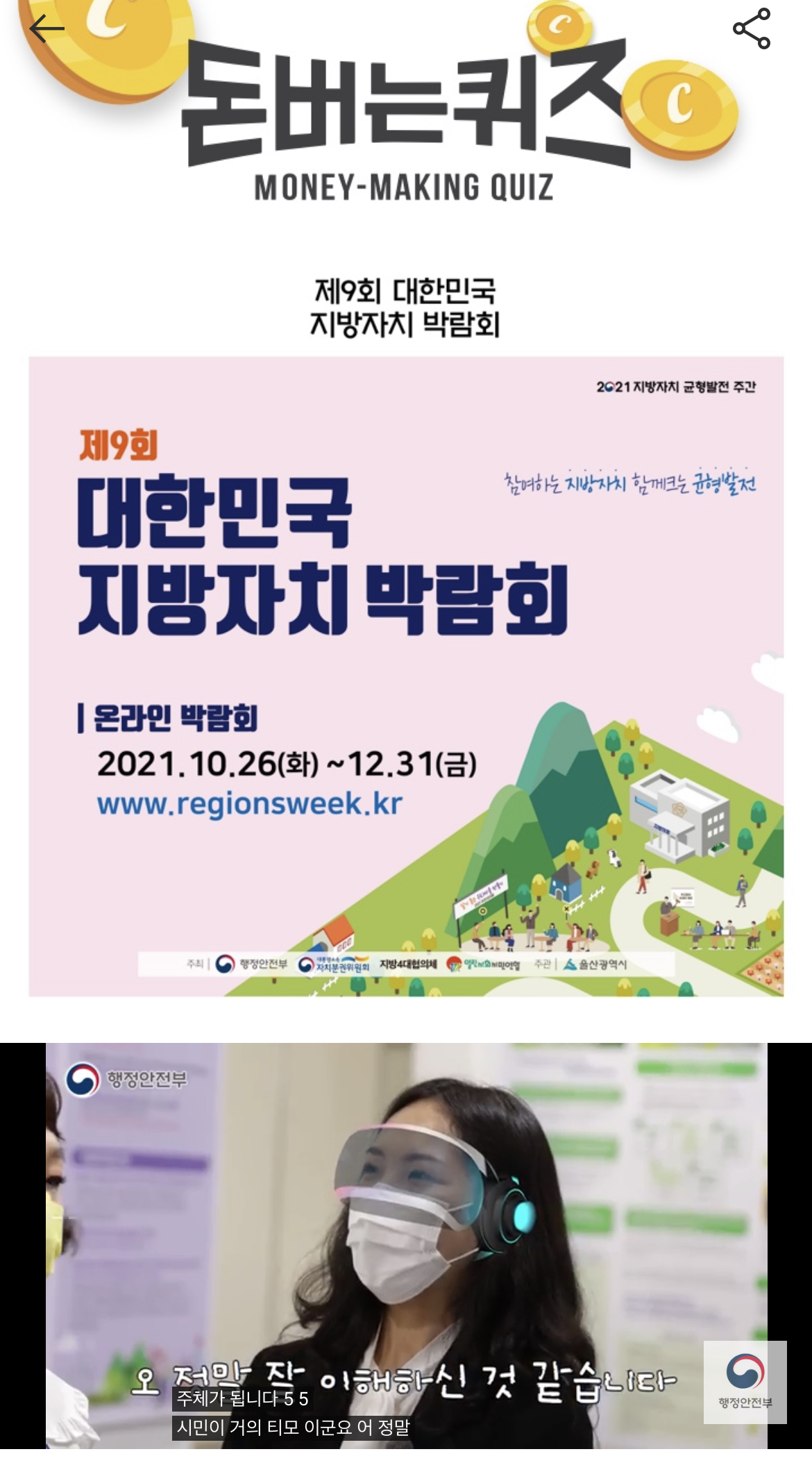 캐시워크 돈버는 퀴즈 정답 2021 지방자치 균형발전 주간 제O회 대한민국 지방자치 박람회 숫자