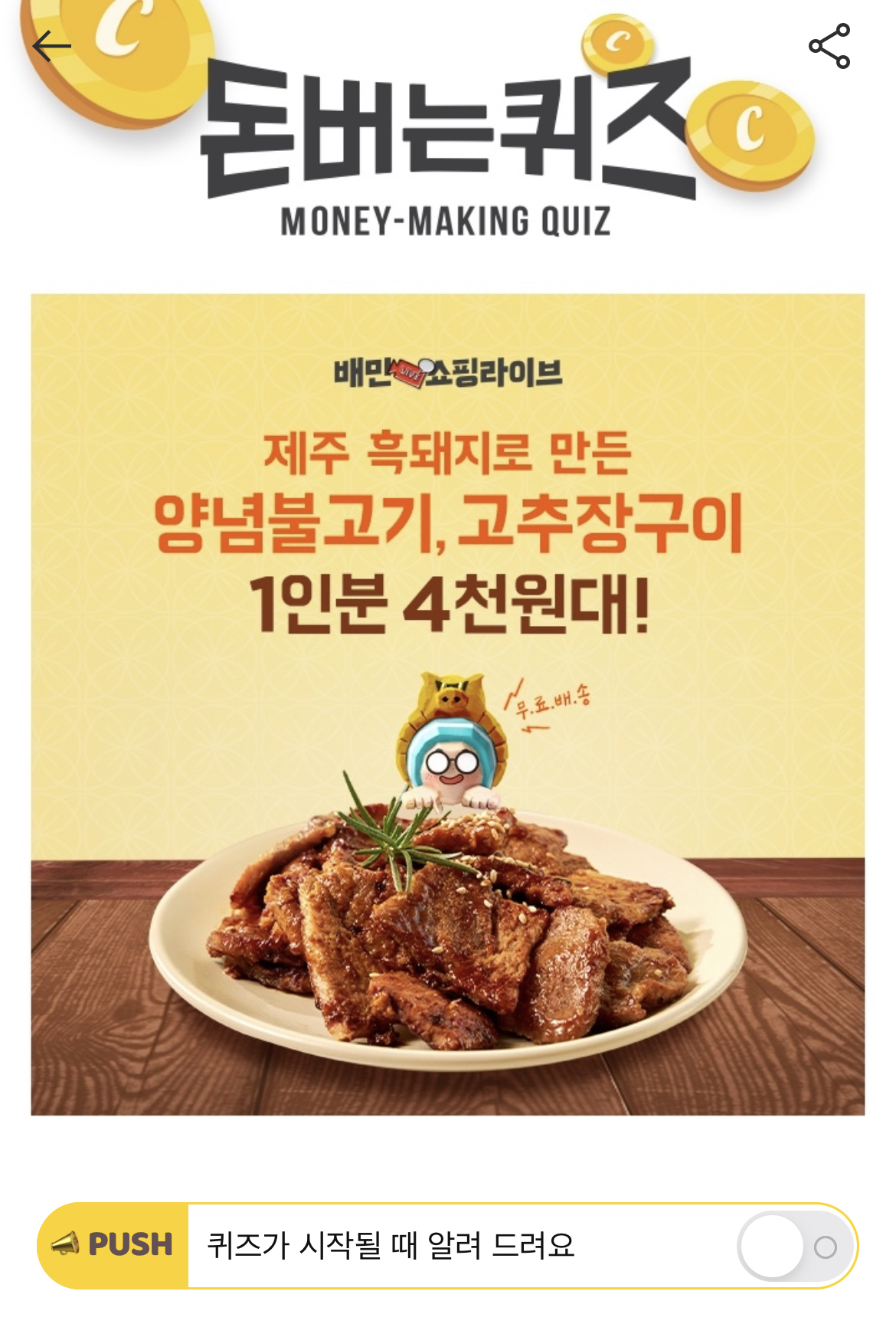 캐시워크 돈버는 퀴즈 정답 배민쇼핑라이브 흑돼지 양념 구이 숫자