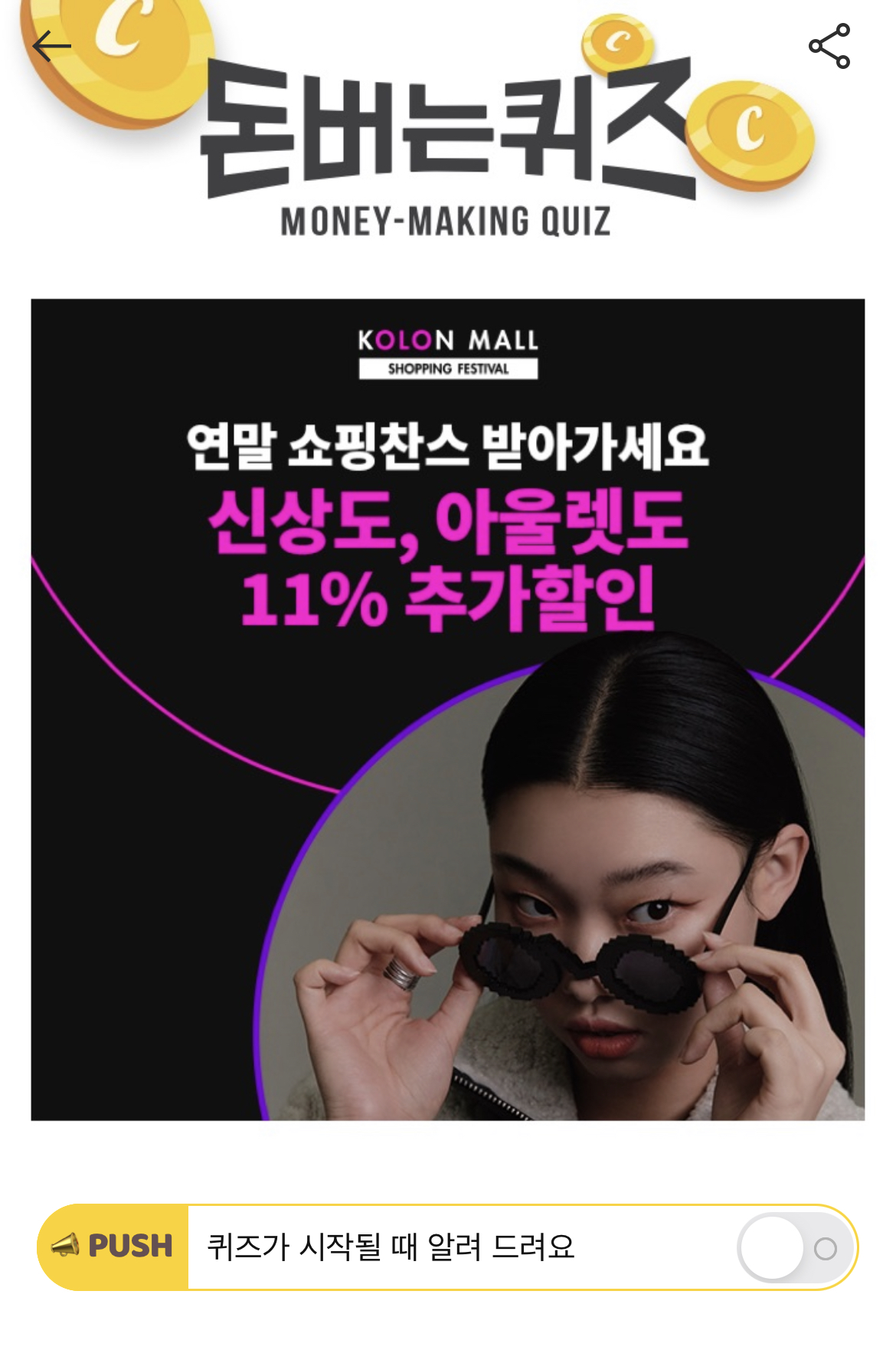 캐시워크 돈버는 퀴즈 정답 코오롱몰 연말 쇼핑찬스 ㄴㄱㄴ