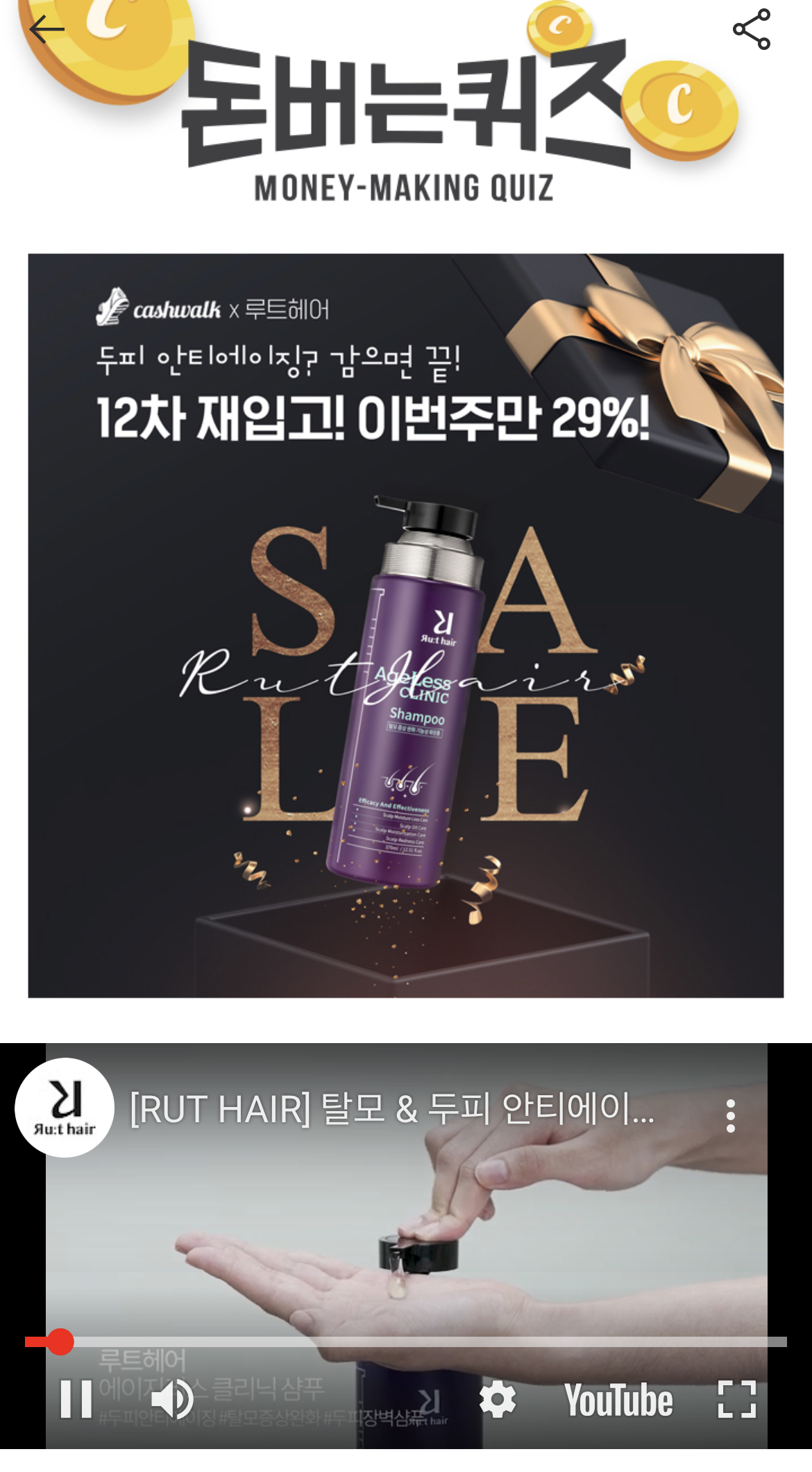 캐시워크 돈버는 퀴즈 정답 루트헤어 클리닉 샴푸 ㄷㅍ