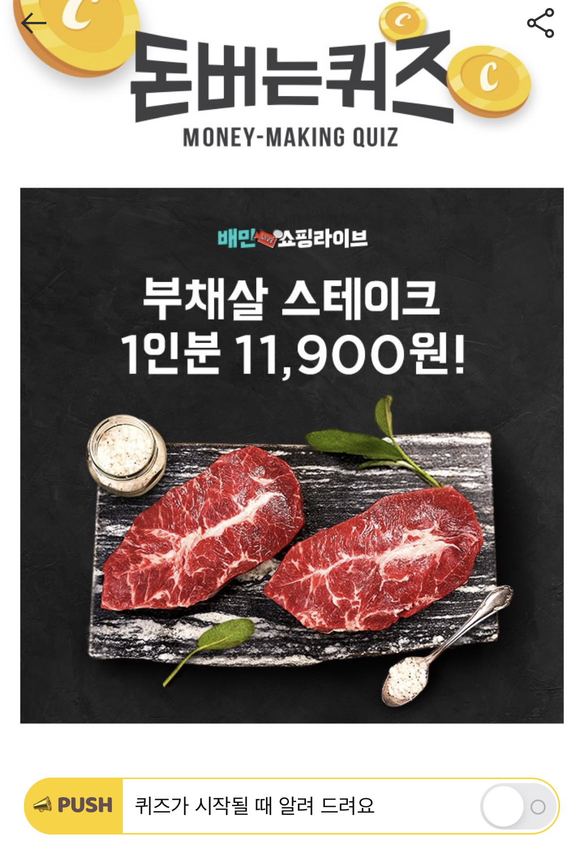 캐시워크 돈버는 퀴즈 정답 배민쇼핑라이브 부채살 스테이크
