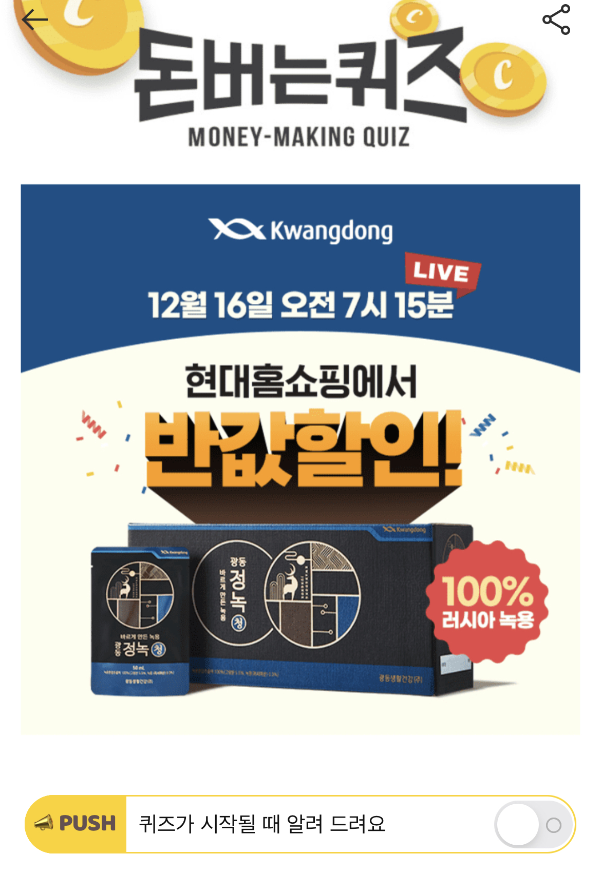 캐시워크 돈버는 퀴즈 정답 현대홈쇼핑 광동 정녹청 ㅇㅈㅈㄱㅅ