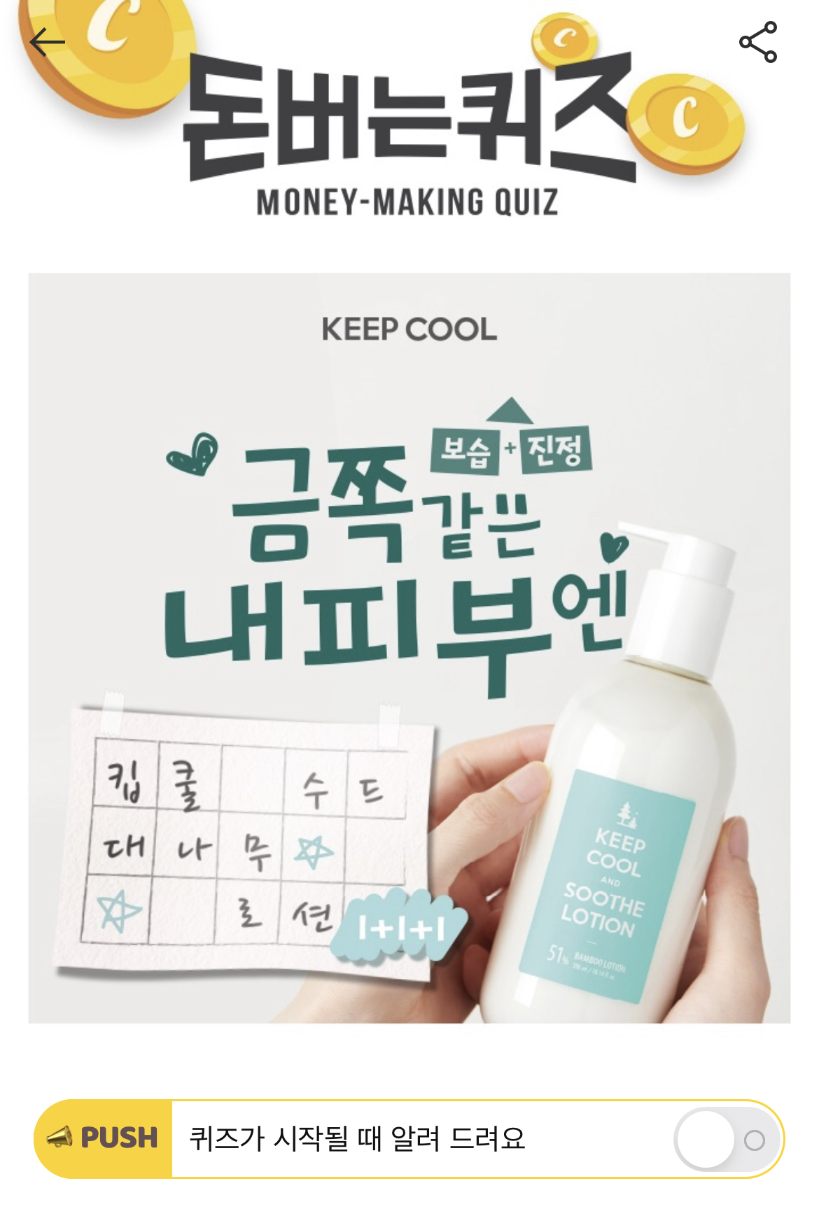 캐시워크 돈버는 퀴즈 정답 킵쿨 수드 대나무 로션 ㅅㅂㄹㄹㅂ