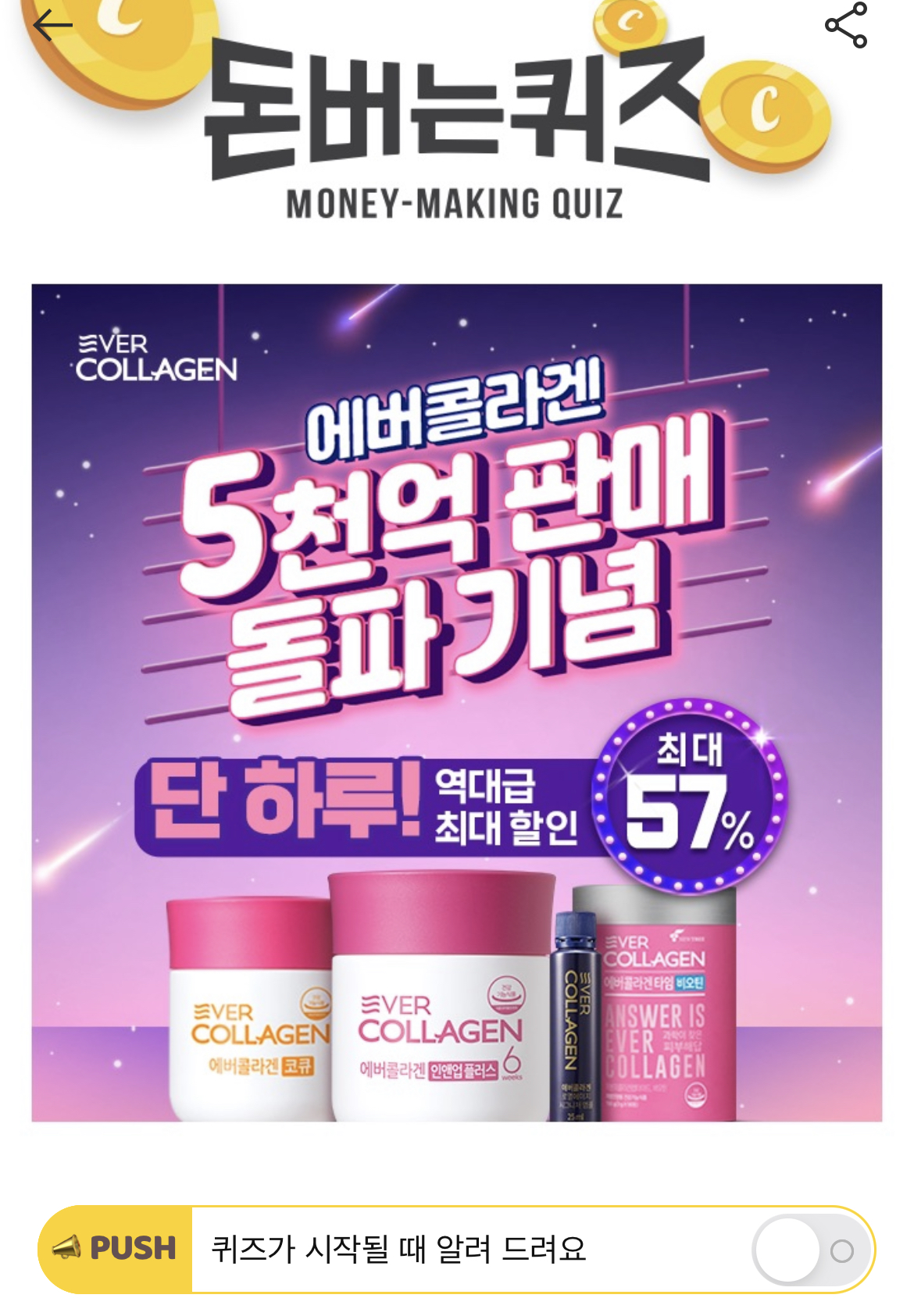 캐시워크 돈버는 퀴즈 정답 대한민국 1등 에버콜라겐 ㅅㅇㅊ