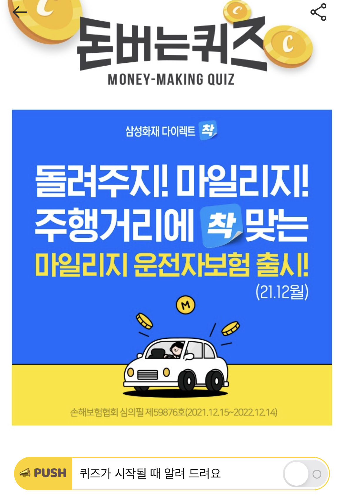 캐시워크 돈버는 퀴즈 정답 삼성화재 다이렉트 마일리지 운전자보험 숫자