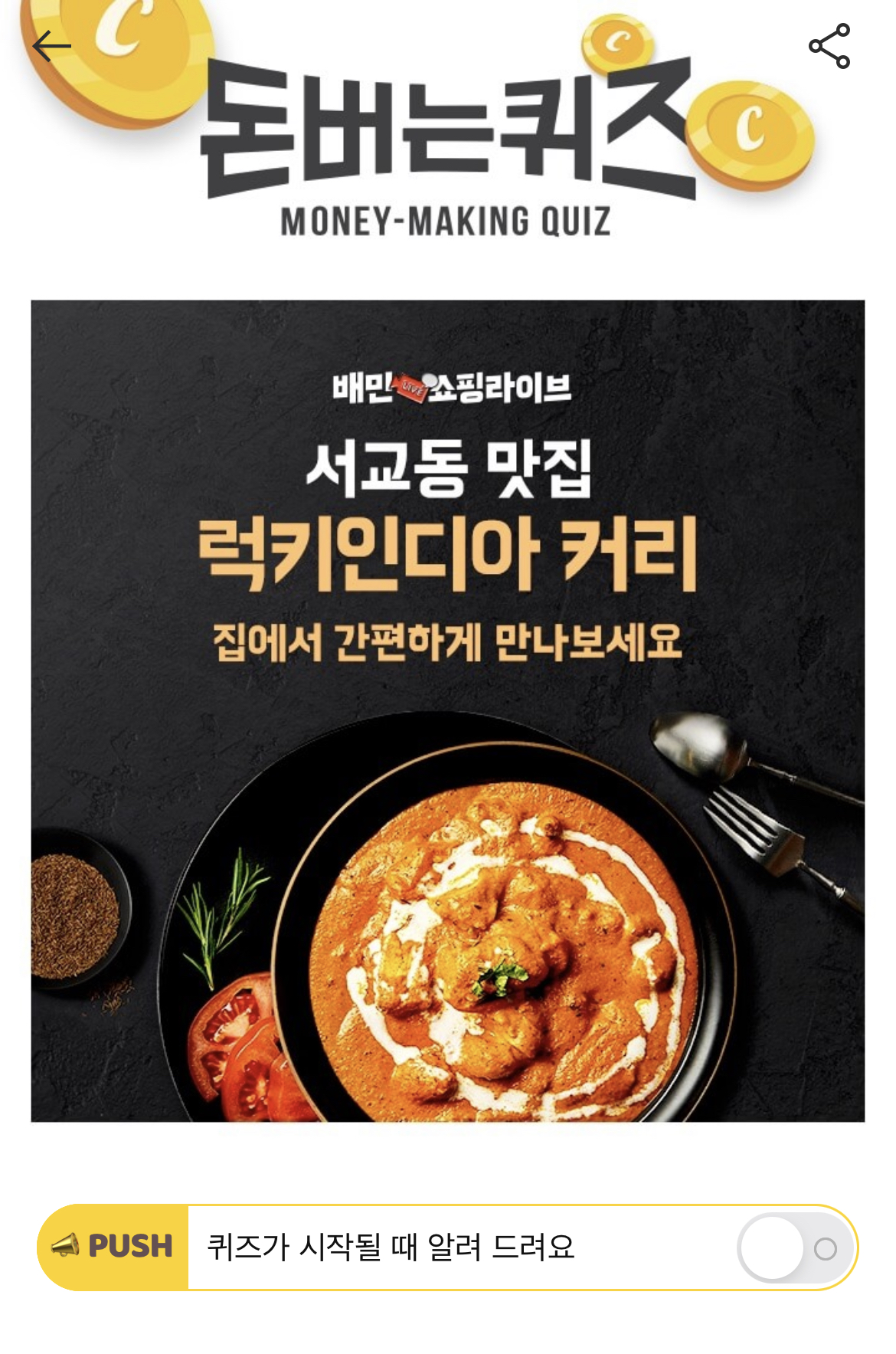 캐시워크 돈버는 퀴즈 정답 배민쇼핑라이브 럭키인디아커리 최대 OO% 할인