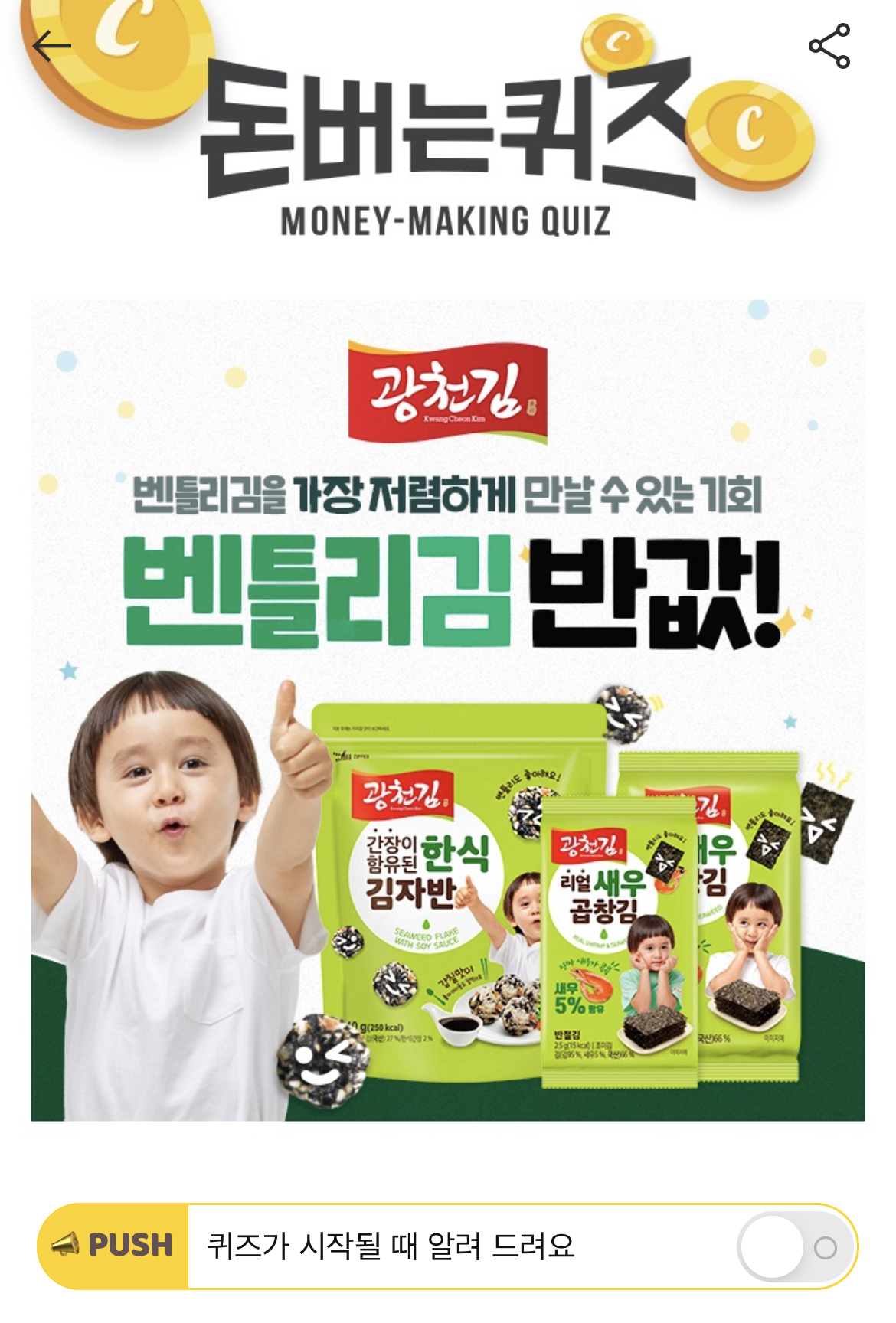 캐시워크 돈버는 퀴즈 정답 광천김 키즈김 귀염둥이 모델 ㅂㅌㄹ