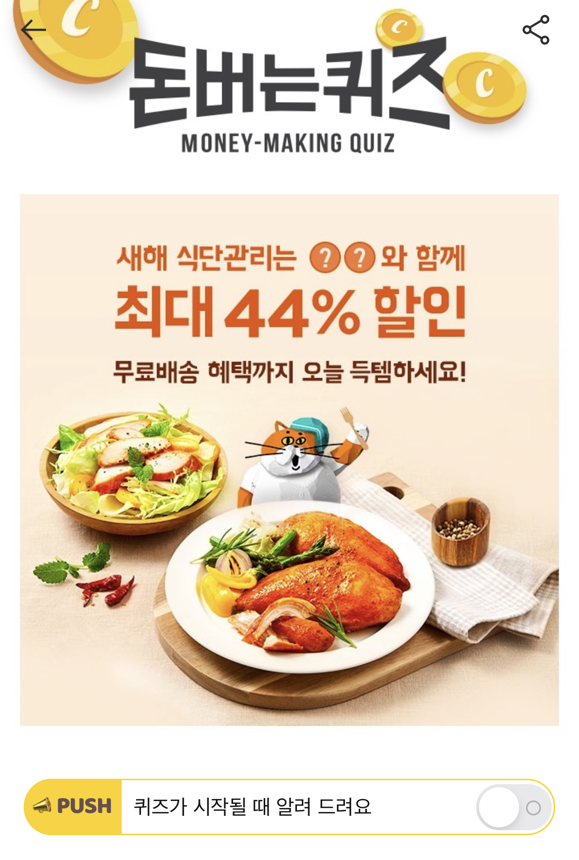캐시워크 돈버는 퀴즈 정답 배민쇼핑라이브 OO닭가슴살 최대 44% 할인