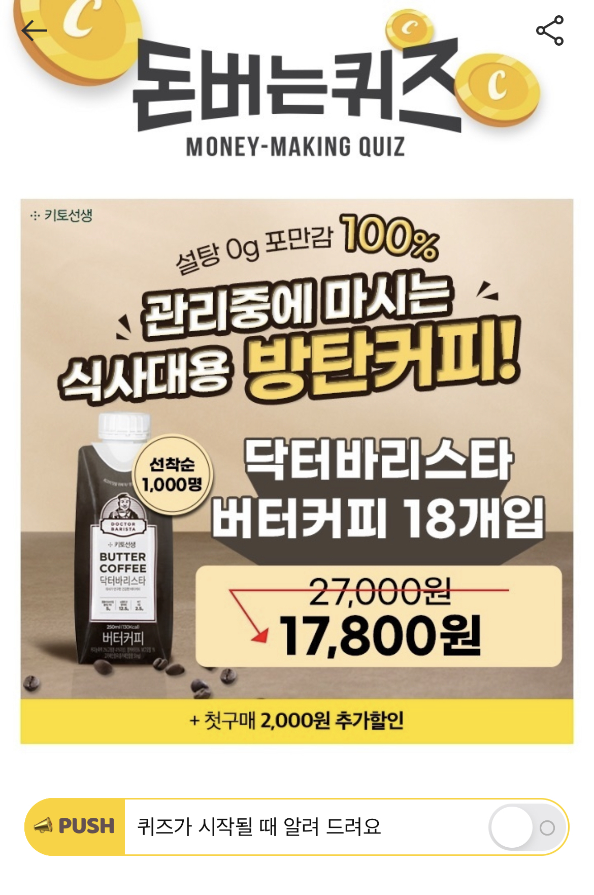 캐시워크 돈버는 퀴즈 정답 키토선생 방탄커피 닥터바리스타 후기 직접 OO하고 레시피를 연구