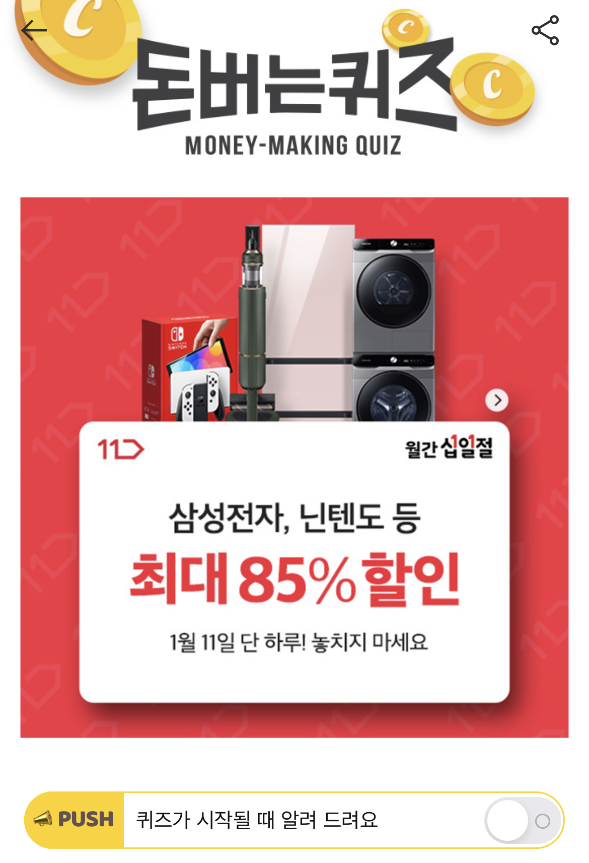 캐시워크 돈버는 퀴즈 정답 11번가 월간 십일절 타임딜 최대 할인율 숫자