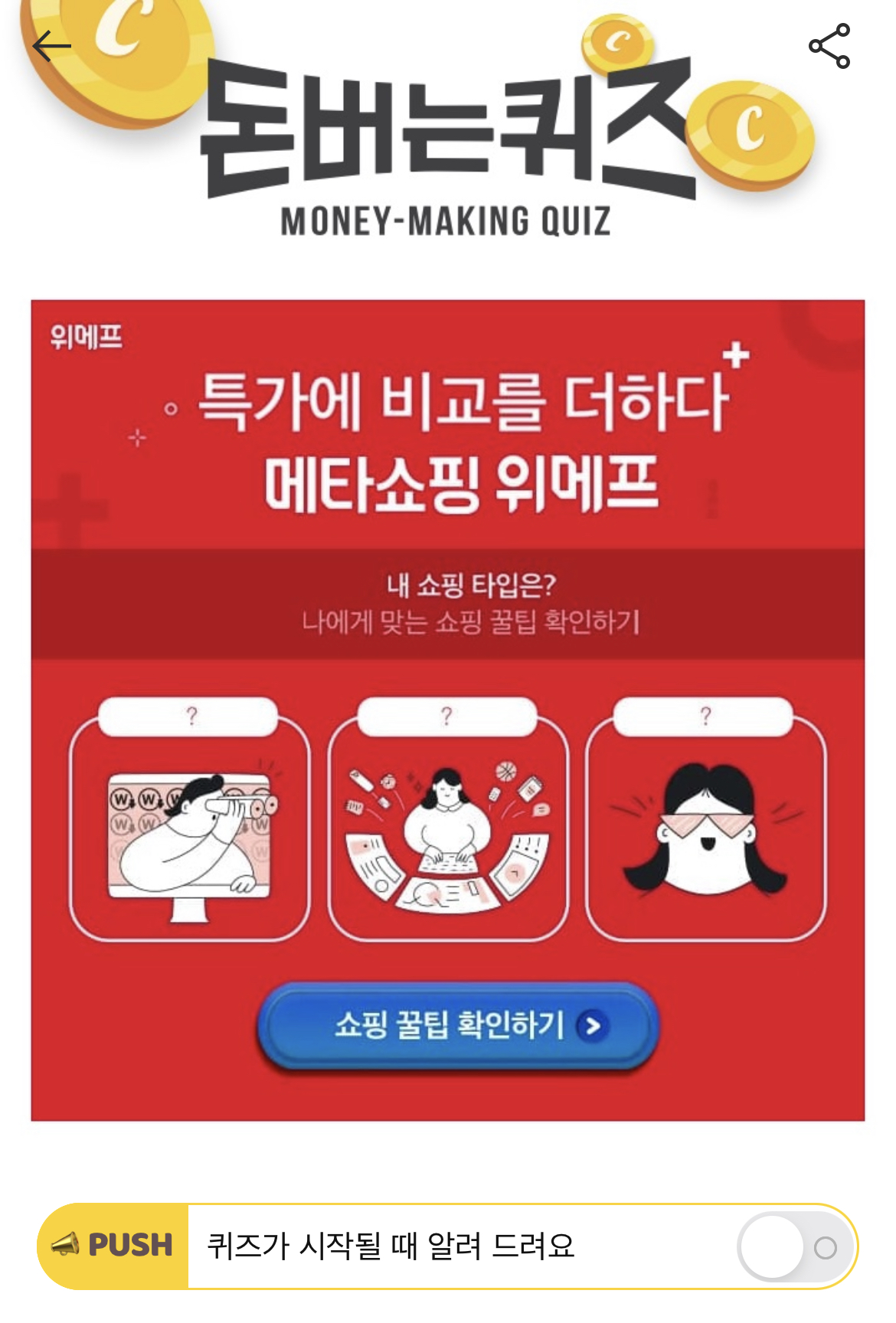 캐시워크 돈버는 퀴즈 정답 메타쇼핑 위메프 쇼핑 Type3 ㅈㅅㅅㅎㅅㅌ