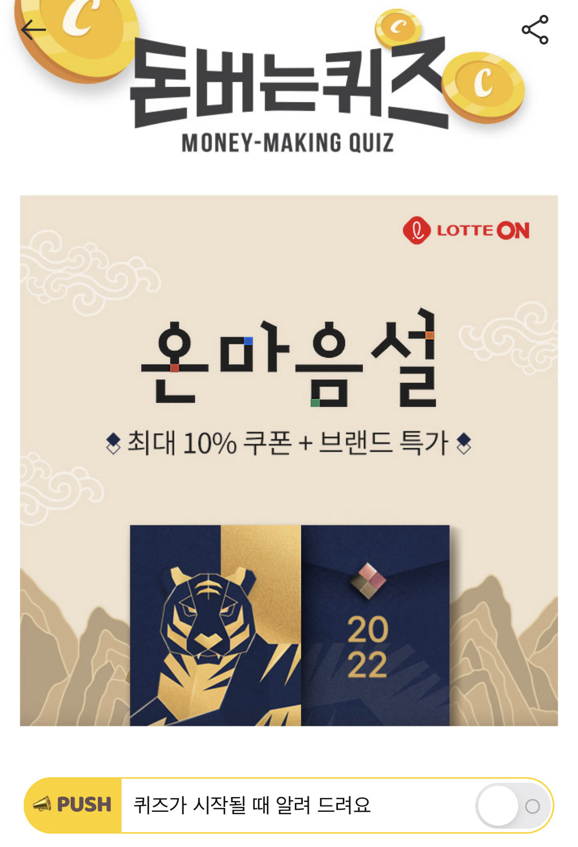 캐시워크 돈버는 퀴즈 정답 롯데온 온마음 설 행사 최대 OO% 카드 할인 숫자