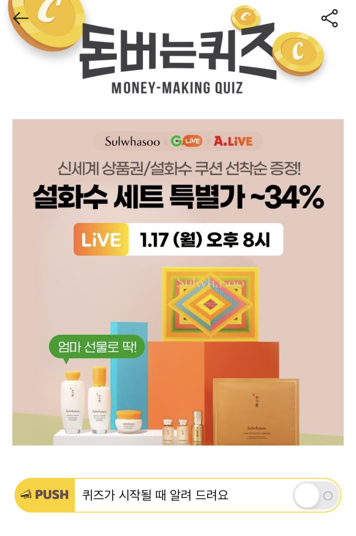캐시워크 돈버는 퀴즈 정답 옥션 설 빅세일 설화수 ㅅㅂㅅㅇ