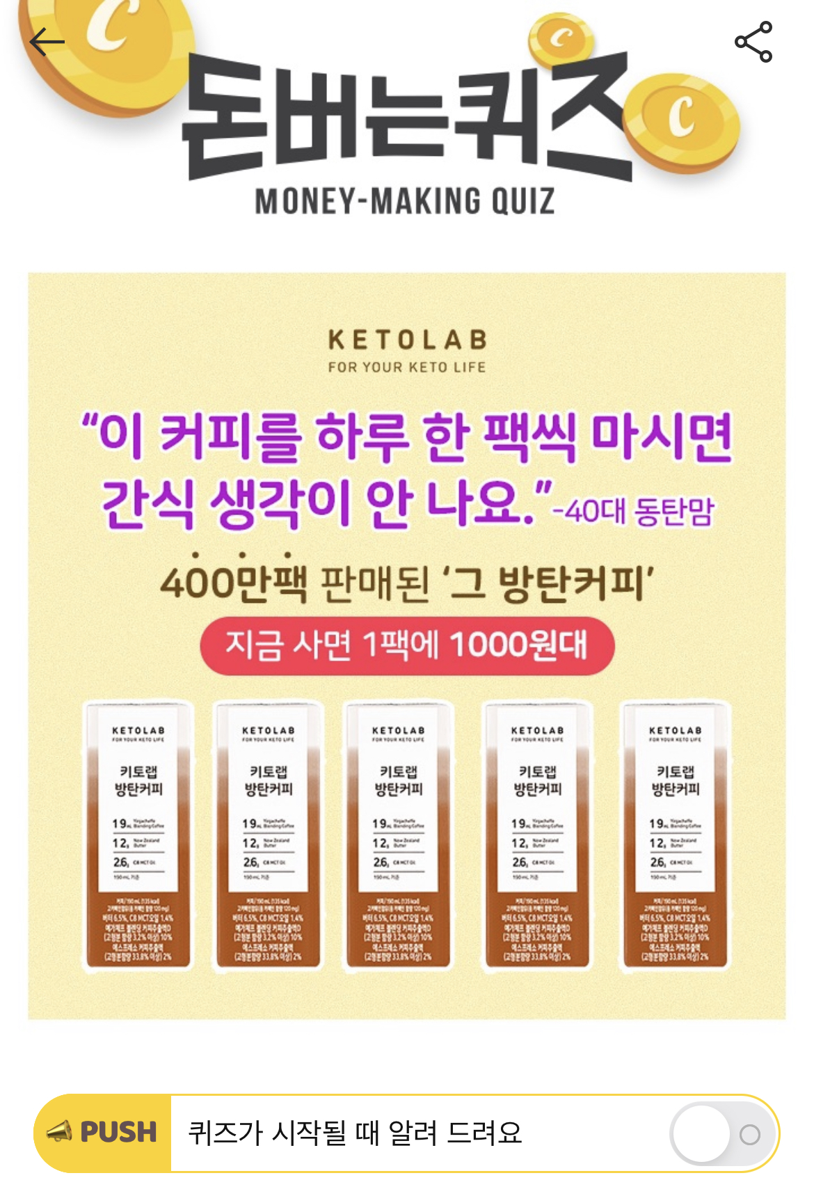 캐시워크 돈버는 퀴즈 정답 키토랩 방탄커피 ㅌㄹㄷ
