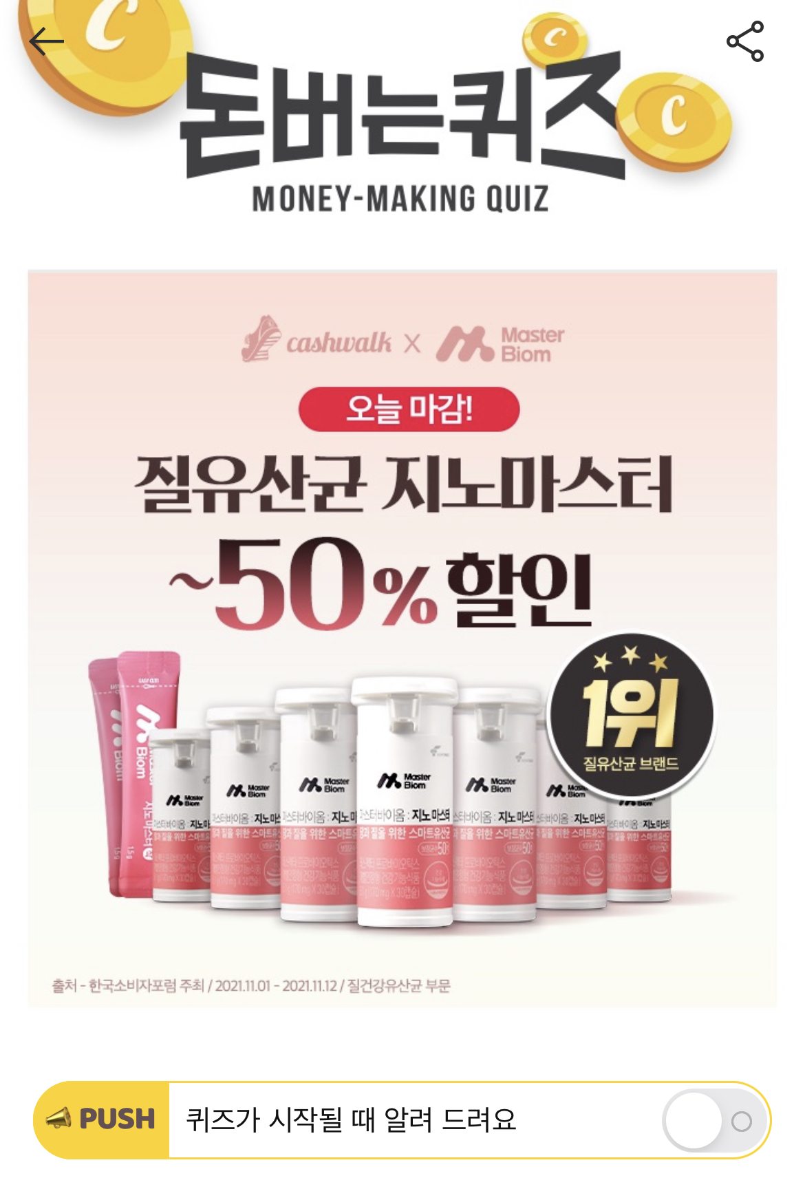 캐시워크 돈버는 퀴즈 정답 지노마스터 OOOO 프로바이오틱스 ㄹㅅㅍㅌ
