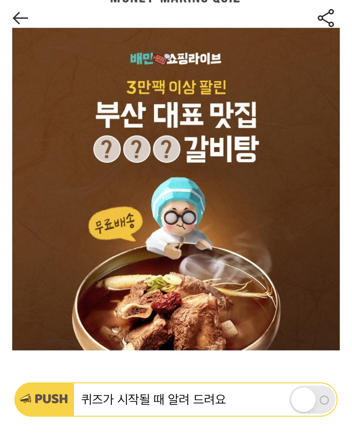 캐시워크 돈버는 퀴즈 정답 배민쇼핑라이브 부산 대표 맛집 ㅇㅇㅇ갈비탕