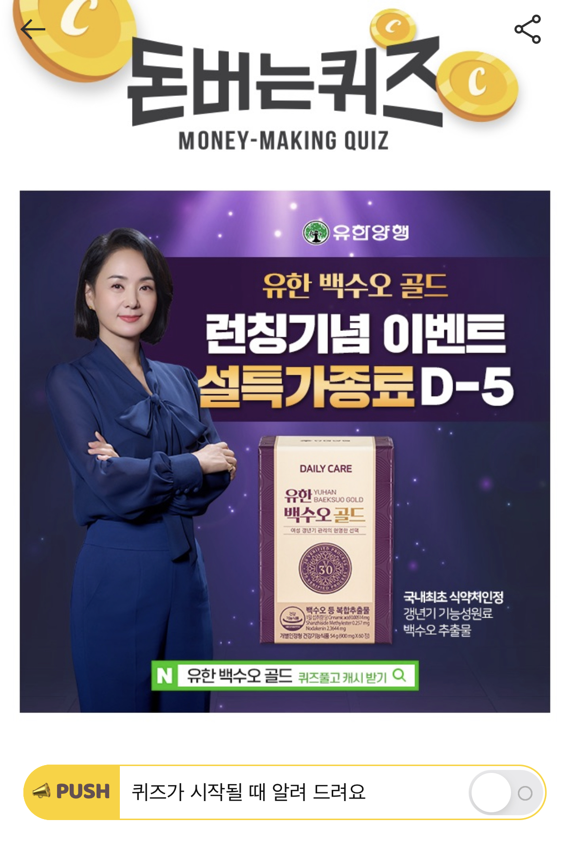 캐시워크 돈버는 퀴즈 정답 유한양행 유한백수오골드 미국FDA ㄱㄱㄱㄴㅅㅅㅈ
