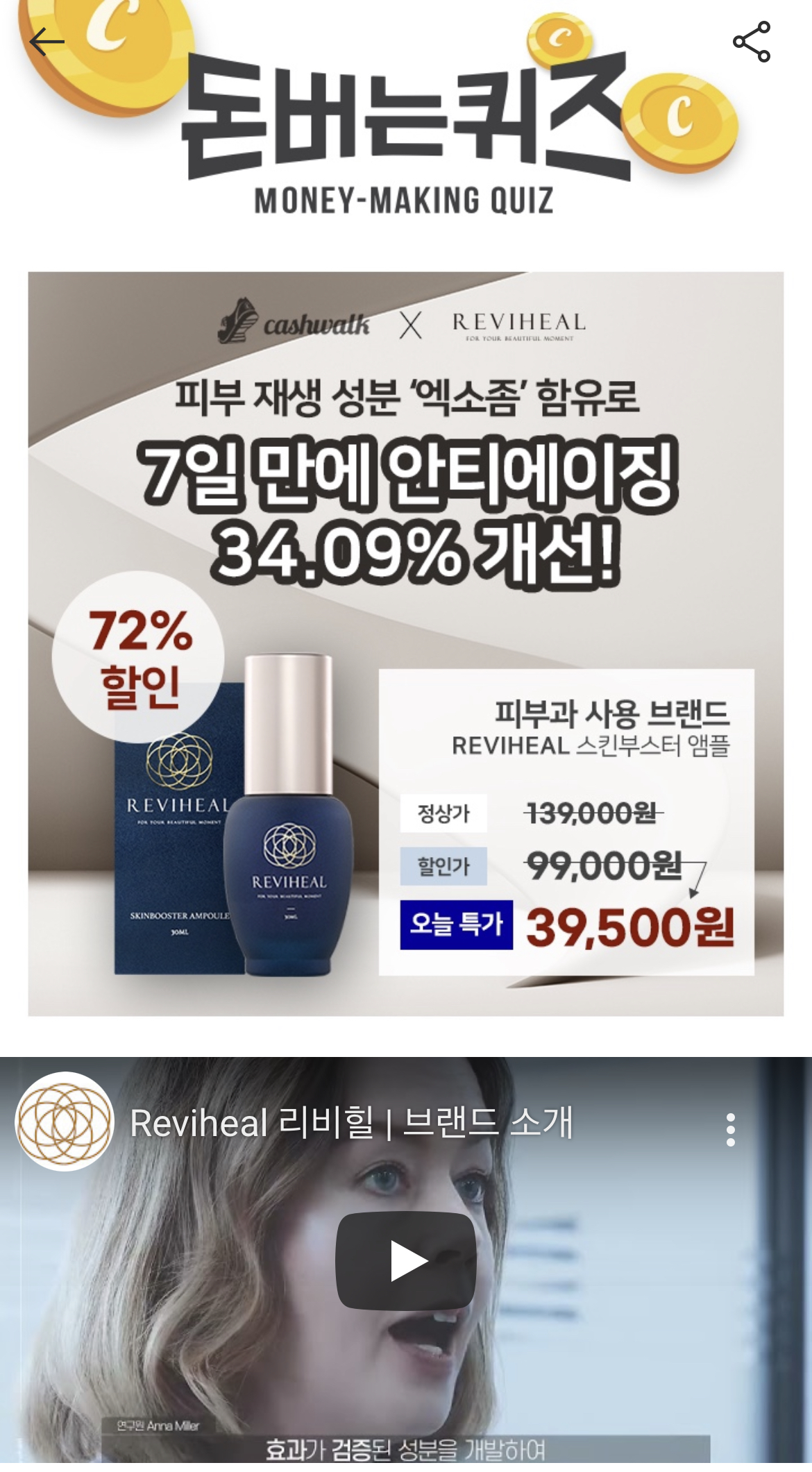 캐시워크 돈버는 퀴즈 정답 리비힐 스킨부스터 앰플 순도 OO% 미백 특화 성분 숫자