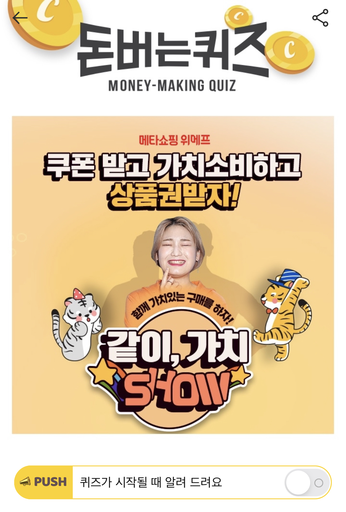 캐시워크 돈버는 퀴즈 정답 위메프 같이, 가치 기획전 상시 OO% 쿠폰 숫자