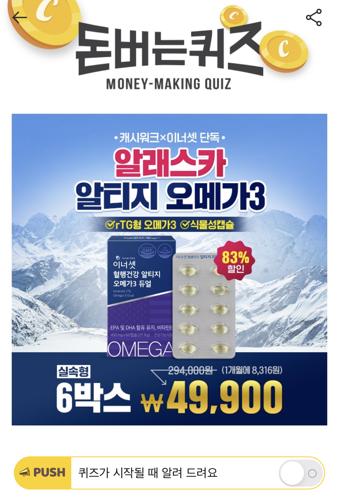 캐시워크 돈버는 퀴즈 정답 이너셋 혈행건강 알티지 오메가3 듀얼 ㅁㅁ