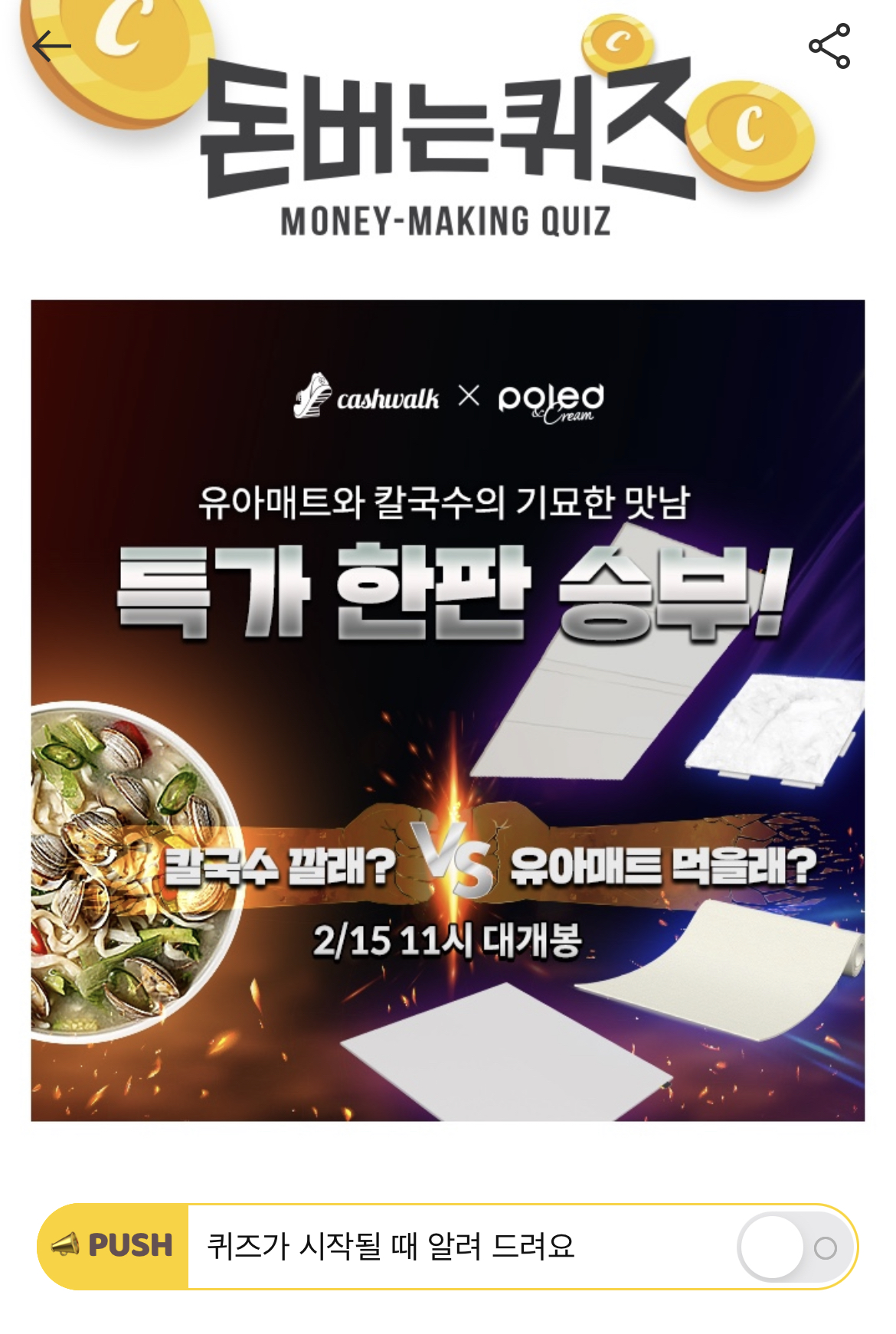 캐시워크 돈버는 퀴즈 정답 폴레드X조조칼국수 폴레드앤크림 광고모델 ㄱㄷㅎ