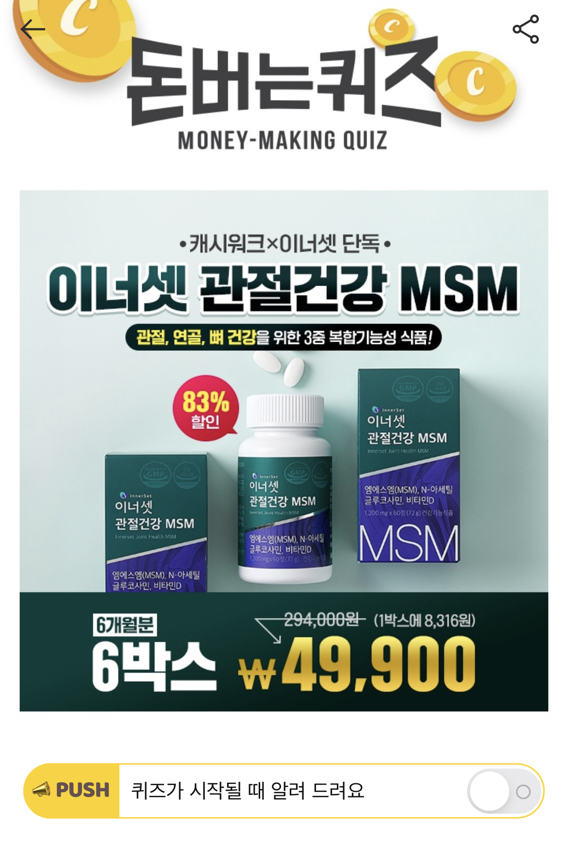 캐시워크 돈버는 퀴즈 정답 이너셋 관절건강 MSM ㅅㅇ