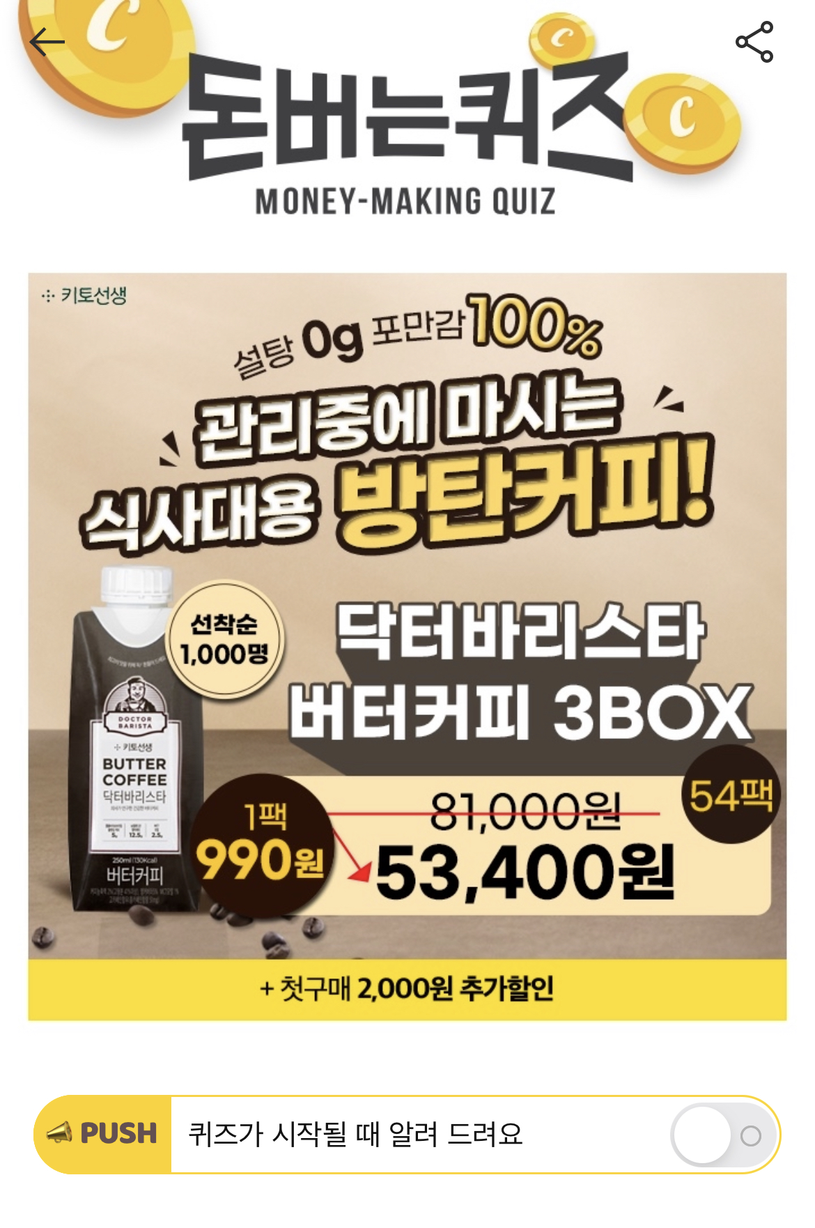 캐시워크 돈버는 퀴즈 정답 키토선생 닥터바리스타 버터커피 후기 MCT 코코넛 오일 숫자