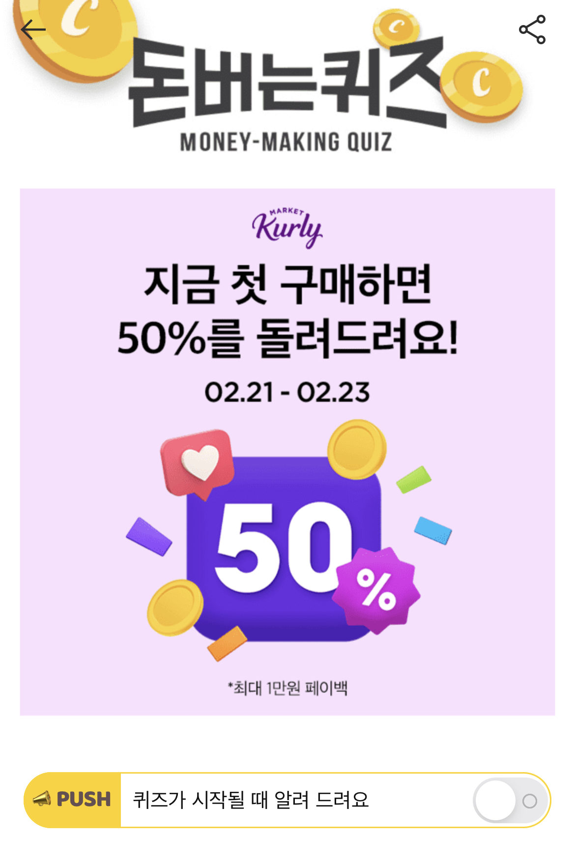 지금 마켓컬리에서 'OOOO'하고 첫 구매하면 전 상품 50% 페이백을 받을 수 있습니다. 여기서 'OOOO'에 들어갈 단어는 무엇일까요?
