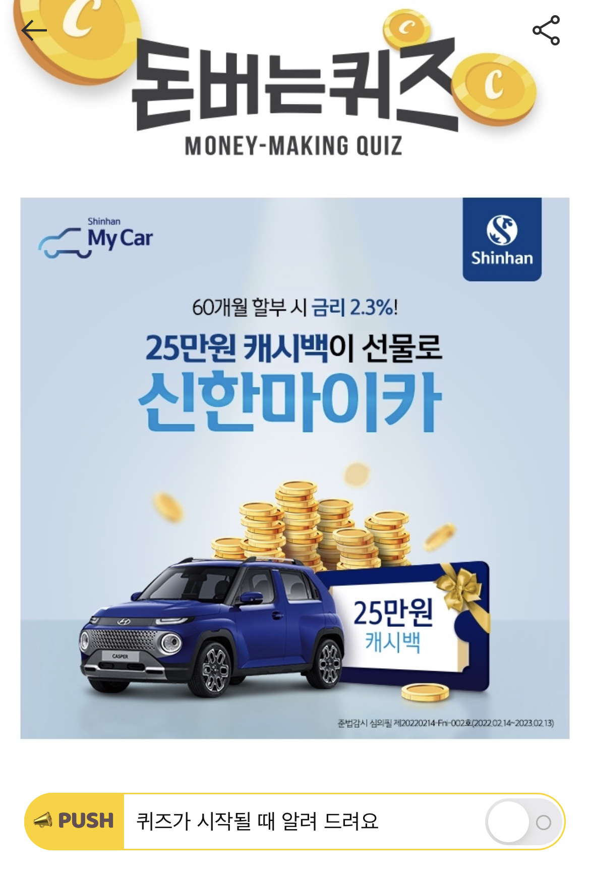 캐시워크 돈버는 퀴즈 정답 신한 마이카 최대 OO만원 캐시백