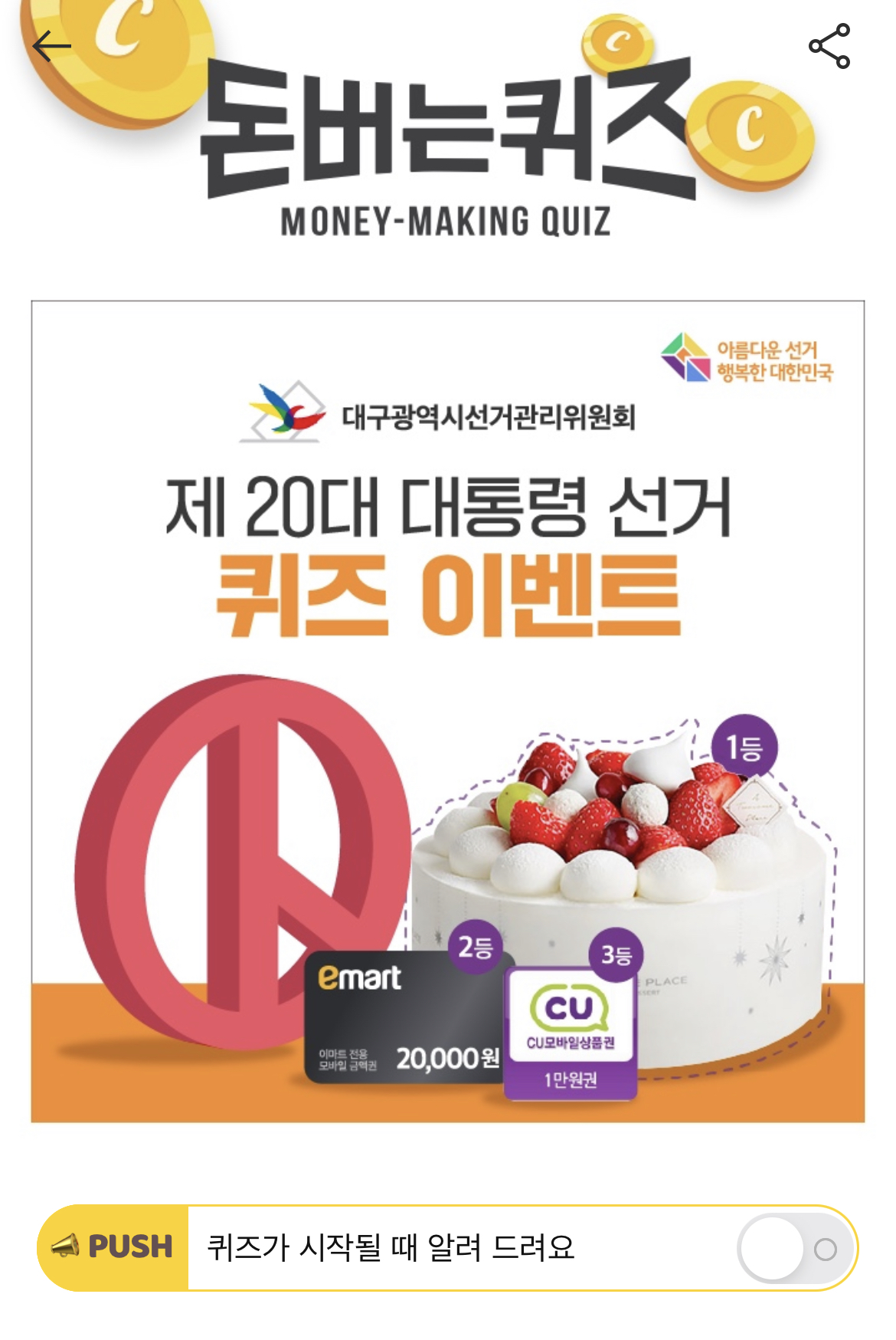 캐시워크 돈버는 퀴즈 정답 제20대 대통령선거의 선거일 ㅅㅇㄱㅇ