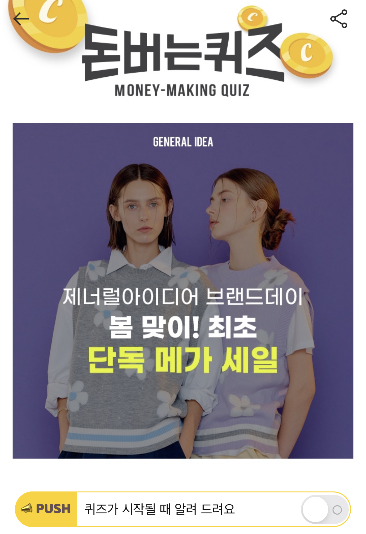 캐시워크 돈버는 퀴즈 정답 제너럴아이디어 자사몰 단독 브랜드데이 할인 쿠폰율 [제너럴아이디어 자사몰 단독 브랜드데이]