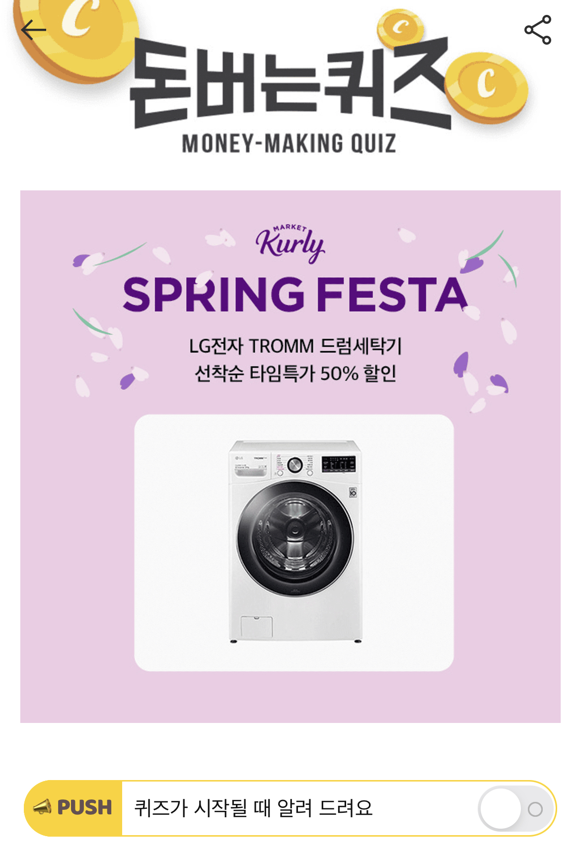 캐시워크 돈버는 퀴즈 정답 마켓컬리 타임 어택 LG전자 TROMM 드럼세탁기 할인율 숫자