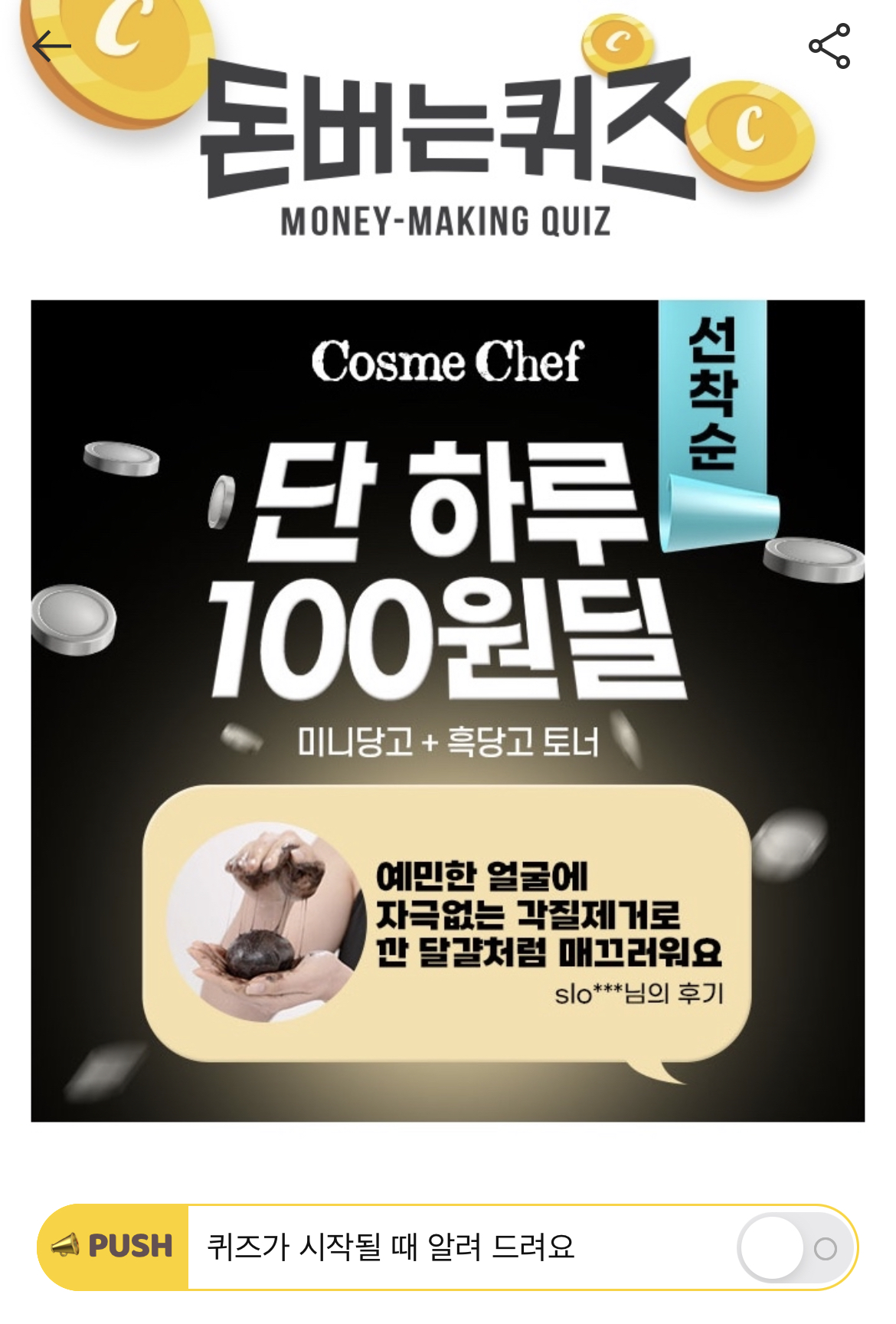 캐시워크 돈버는 퀴즈 정답 코스메쉐프 미니당고 흑당고 토너 ㅎㄷㄱ